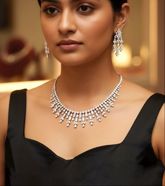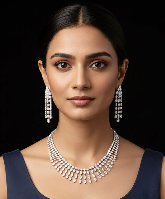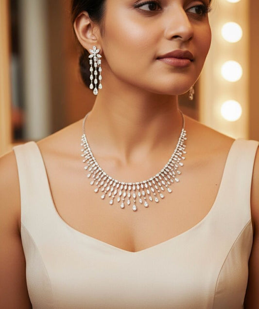 18Karat White Gold Diamond Fringe Waterfall Princess Necklace Set