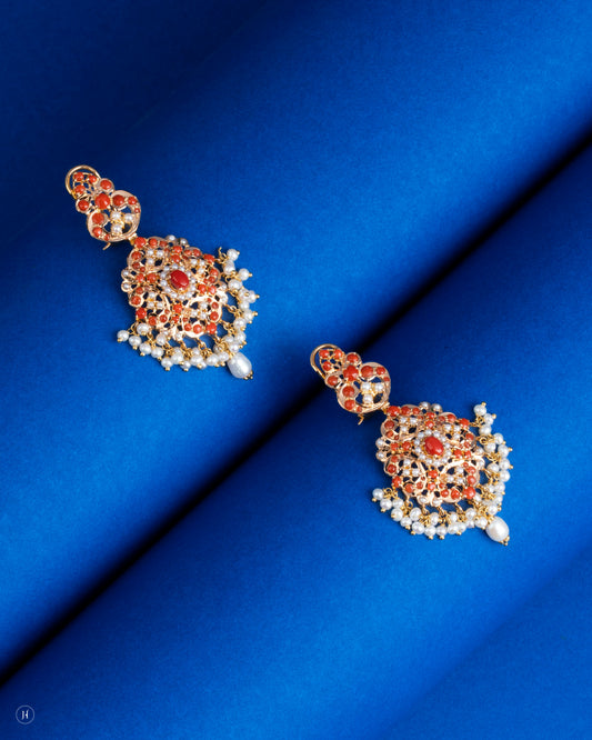 21Kt Yellow Gold Pakistani Floral Ruby Pearl Layered Long Necklace Set