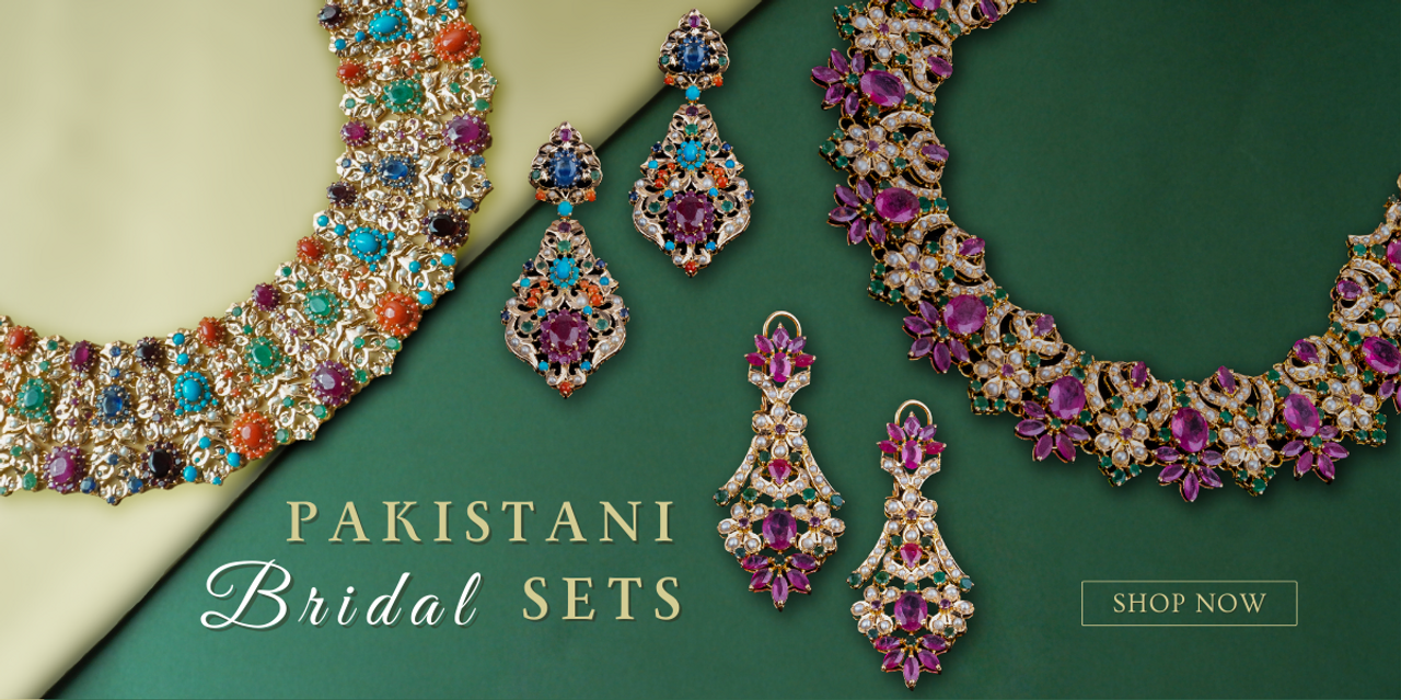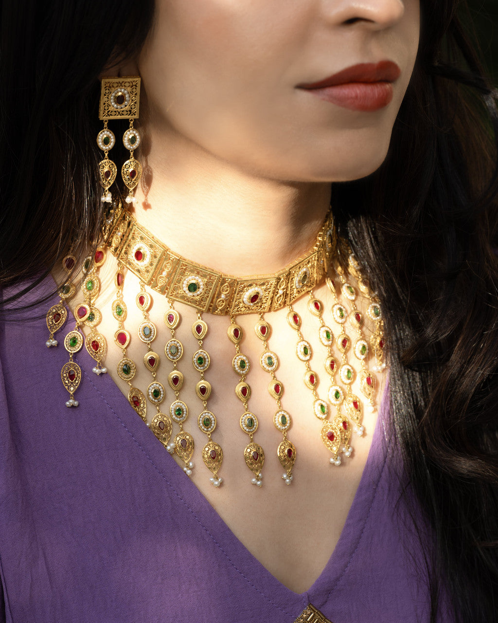 21K Yellow Gold Pakistani Triple-Layer Multistone Necklace Set