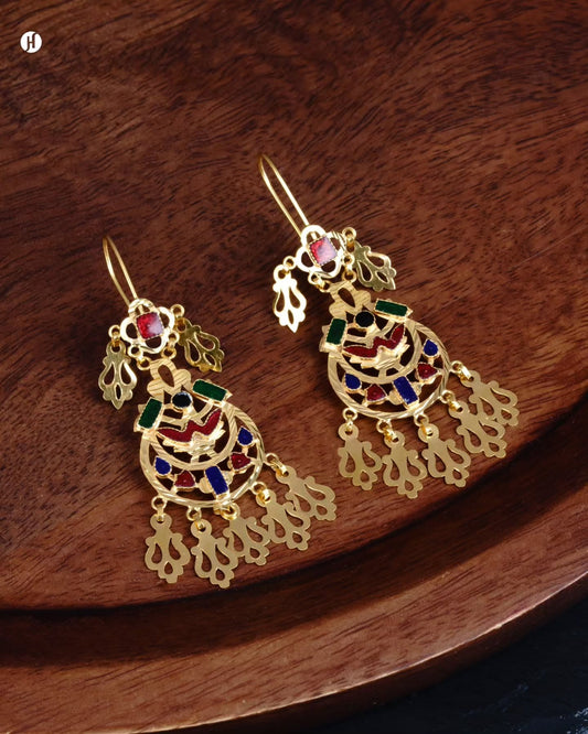 21K Yellow Gold Bahraini Peacock Meena Design Hairpin with Leaf Drops