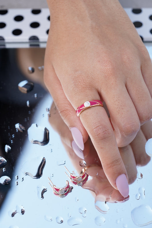 18K Rose Gold Pink Enamel Diamond Earrings Ring Set