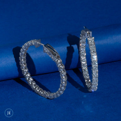These 18K white gold hoop earrings features a row lab grown diamonds on the outside and inside of the hoop and fastens with a secure lock.