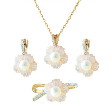 18K Rose Gold Flower Pearl Diamond Pendant Set