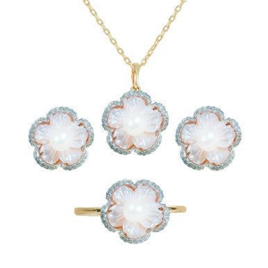 18K Rose Gold Mother of Pearl Flower Diamond Pendant Set