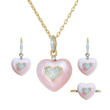 This 18K rose gold pendant features a mother of pearl heart embellished with diamonds. It comes with wirehook drop earrings, a ring and accompanying lightweight chain that fastens with a lobster clasp.