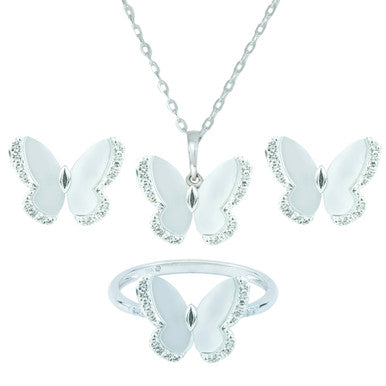This 18K white gold pendant features a mother of pearl butterfly embellished with diamonds. It comes with pushback stud earrings, a ring and accompanying lightweight chain that fastens with a lobster clasp.