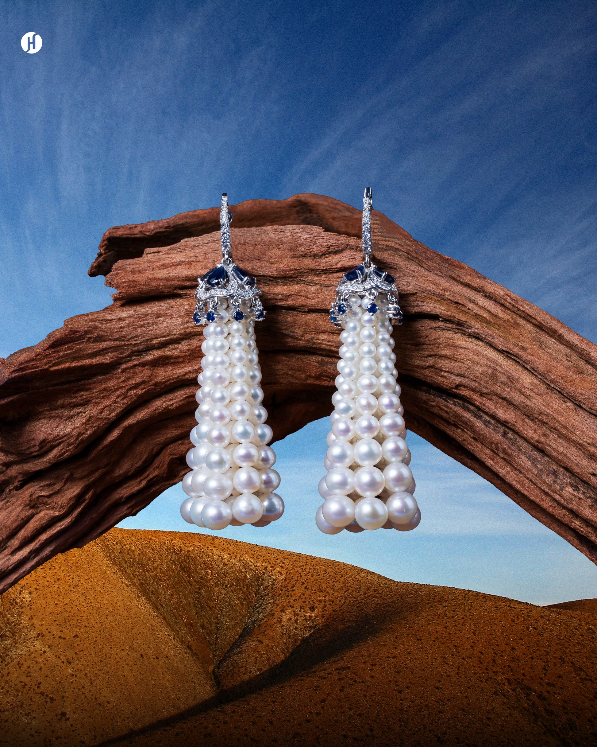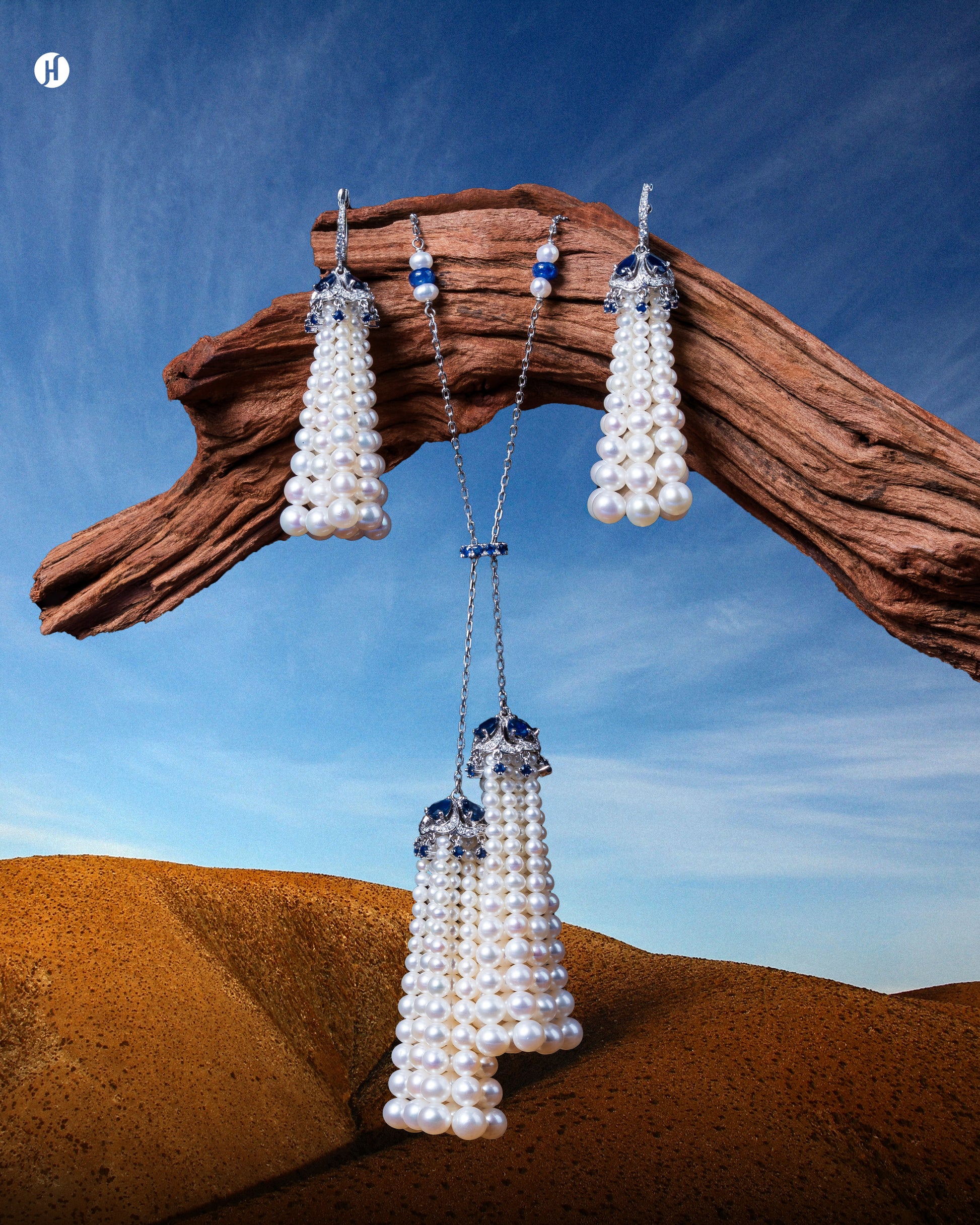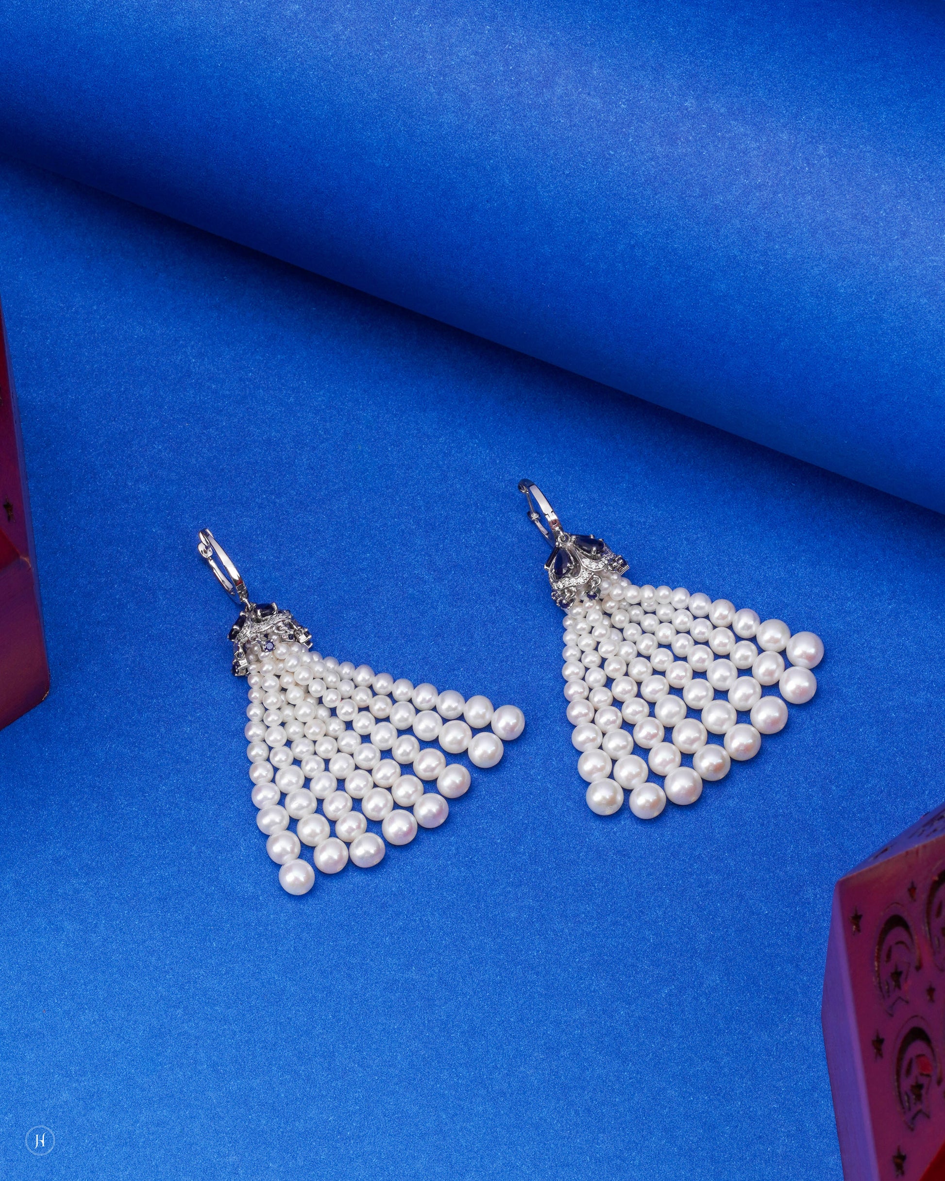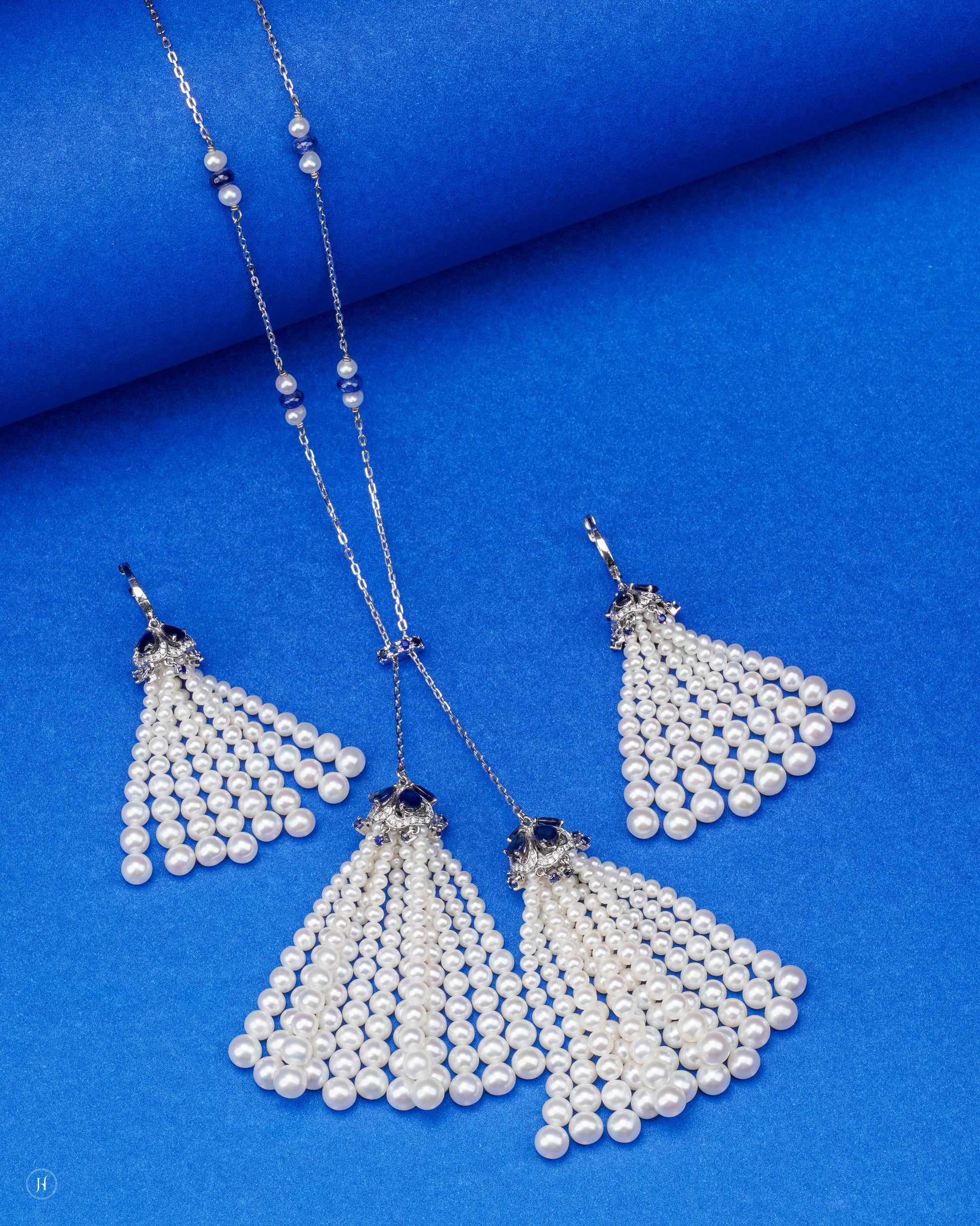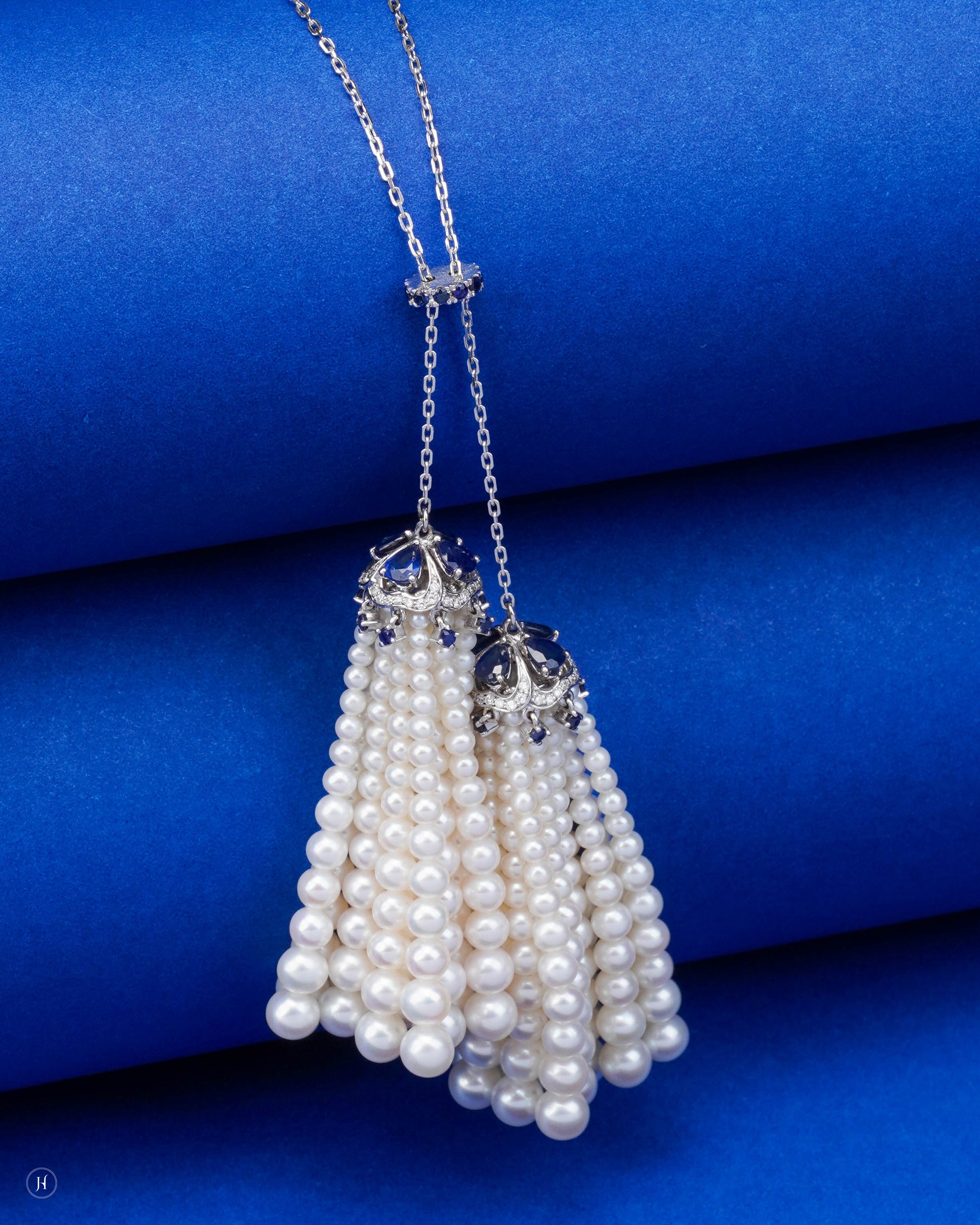 This 18Karat white gold luxurious diamond and pearl necklace set features a teardrop-inspired design adorned with vibrant blue sapphire stones and shimmering diamond accents. The two pendant is complemented by cascading strands of lustrous freshwater pearls, creating a dramatic tassel effect. Matching earrings mirror the pendant’s elegance, completing the look with timeless charm.