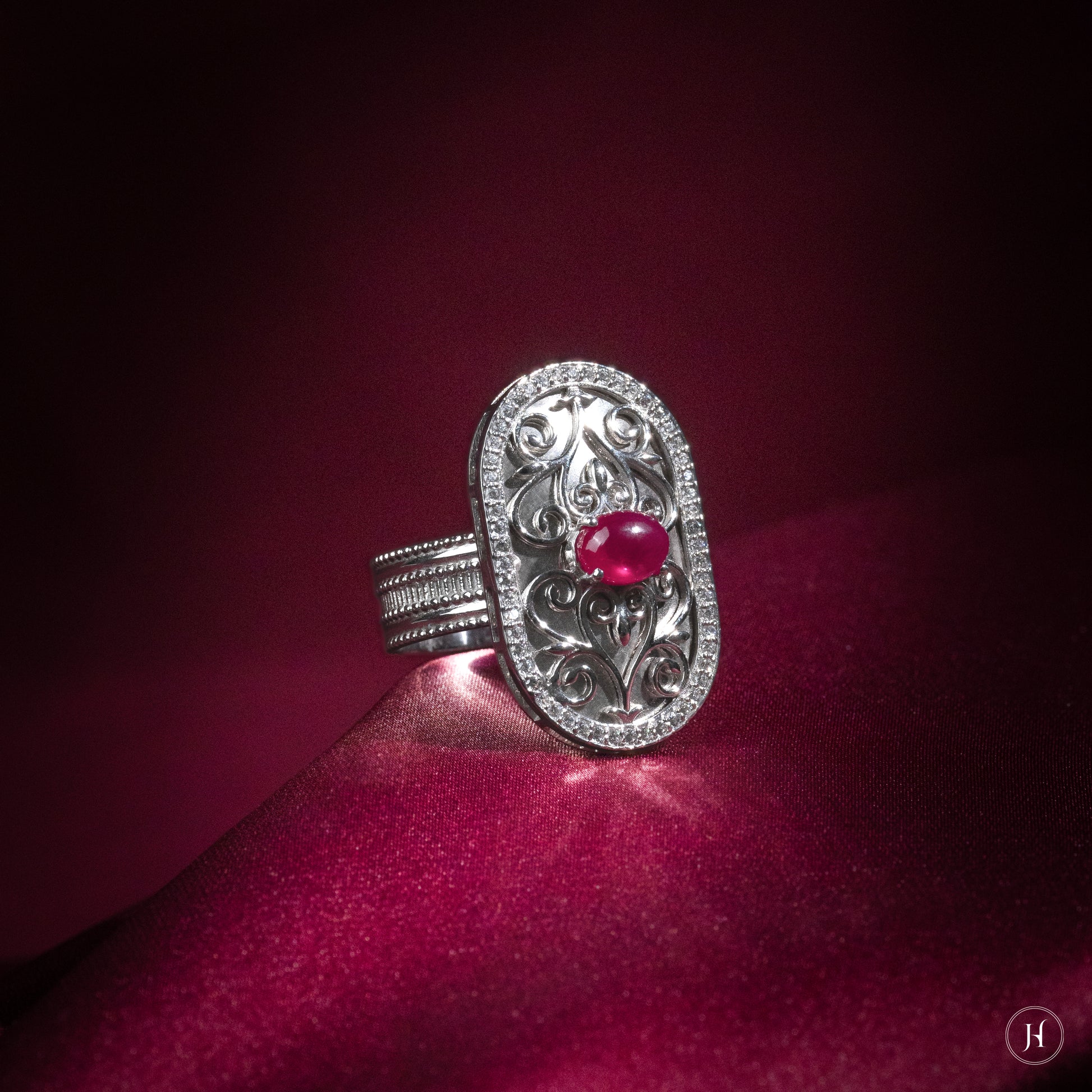 A traditional statement 18K white gold Emirati ring features a red center stone and an intricate Emirati design. This ring sits vertically on your finger.