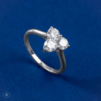 This 18K white gold ring features 3 round lab grown diamonds set in a triangle.