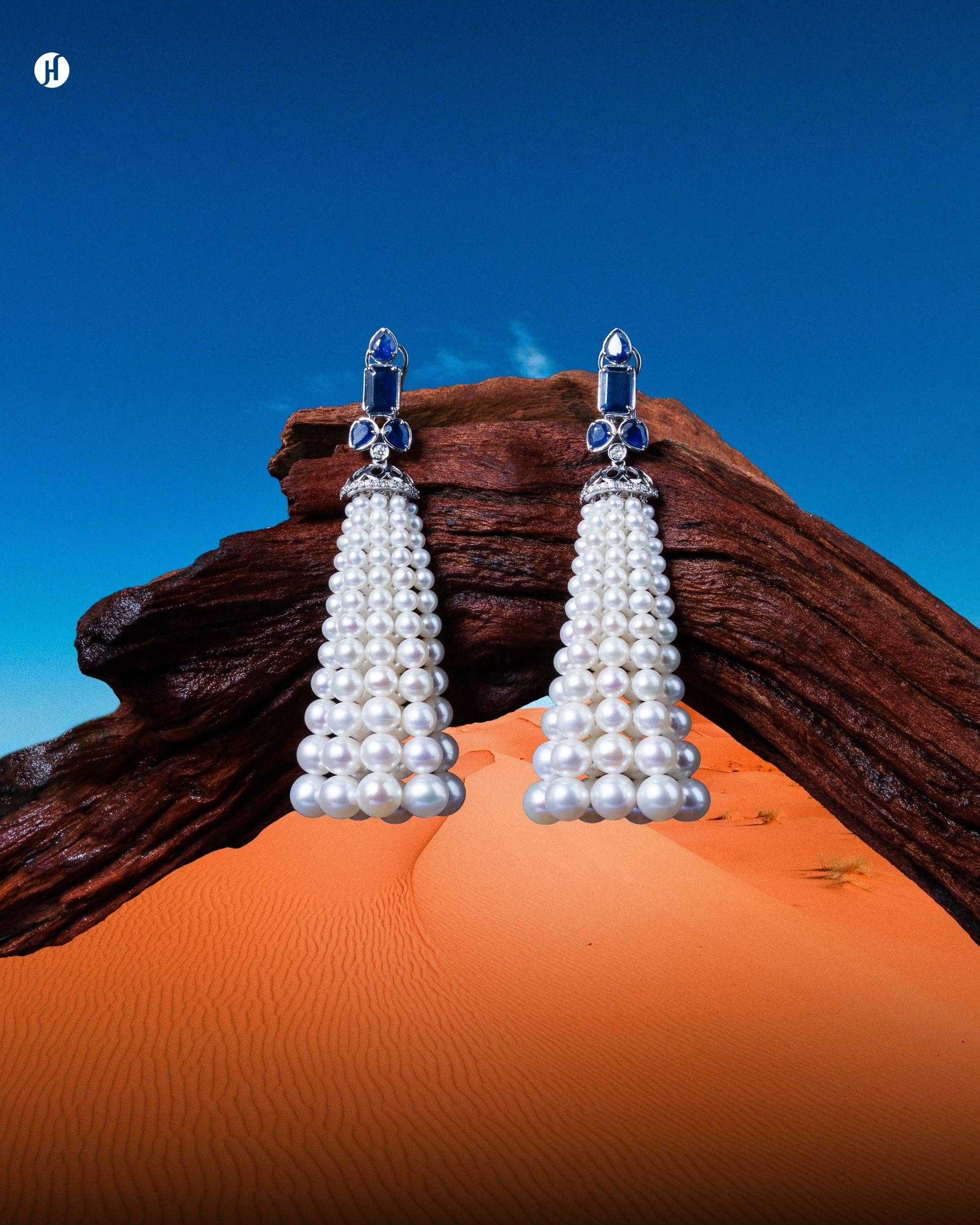 This 18Karat white gold luxurious diamond and pearl necklace set features a teardrop-inspired design adorned with vibrant blue sapphire stones and shimmering diamond accents. The pendant is complemented by cascading strands of lustrous freshwater pearls, creating a dramatic tassel effect. Matching earrings mirror the pendant’s elegance, completing the look with timeless charm.