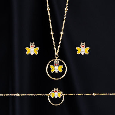 This 18K yellow gold baby pendant necklace set features a bee-shaped motif in a round ring with a beaded chain. It is accompanied by matching earrings and a bracelet.