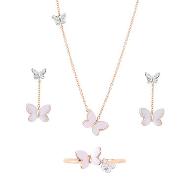 This 18K rose gold lightweight necklace features two mother of pearl butterflies embellished with diamonds. It comes with pushback drop earrings that hang from butterfly shaped diamonds and a ring, while the necklace fastens with a lobster clasp.