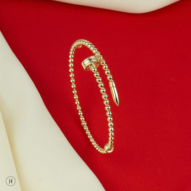 This 18K Italian yellow gold round beaded cuff bangle features militia nail and hammer motif.