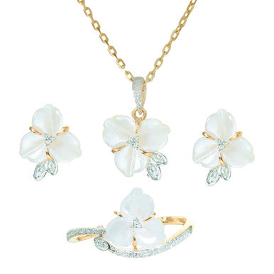 18K Yellow Gold Mother of Pearl Fleur Diamond Pendant Set