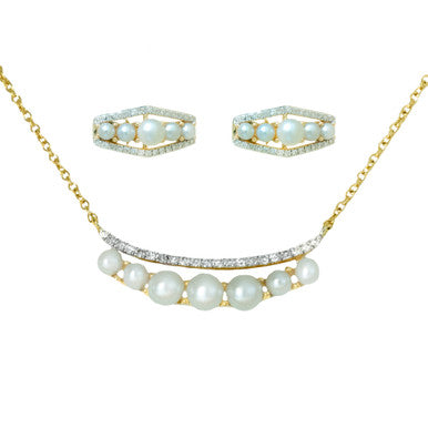 This 18K yellow gold necklace features a line of freshwater pearls encased under a line of diamonds hanging from a light weight chain that fastens with a lobster clasp. It comes with pushback stud earrings, and a ring.