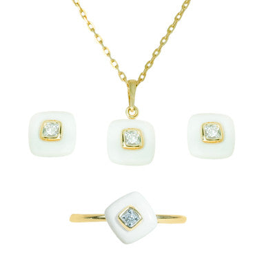 This 18K yellow gold pendant features a square white shell embellished with diamonds. It comes with pushback stud earrings, a ring and accompanying lightweight chain that fastens with a lobster clasp.