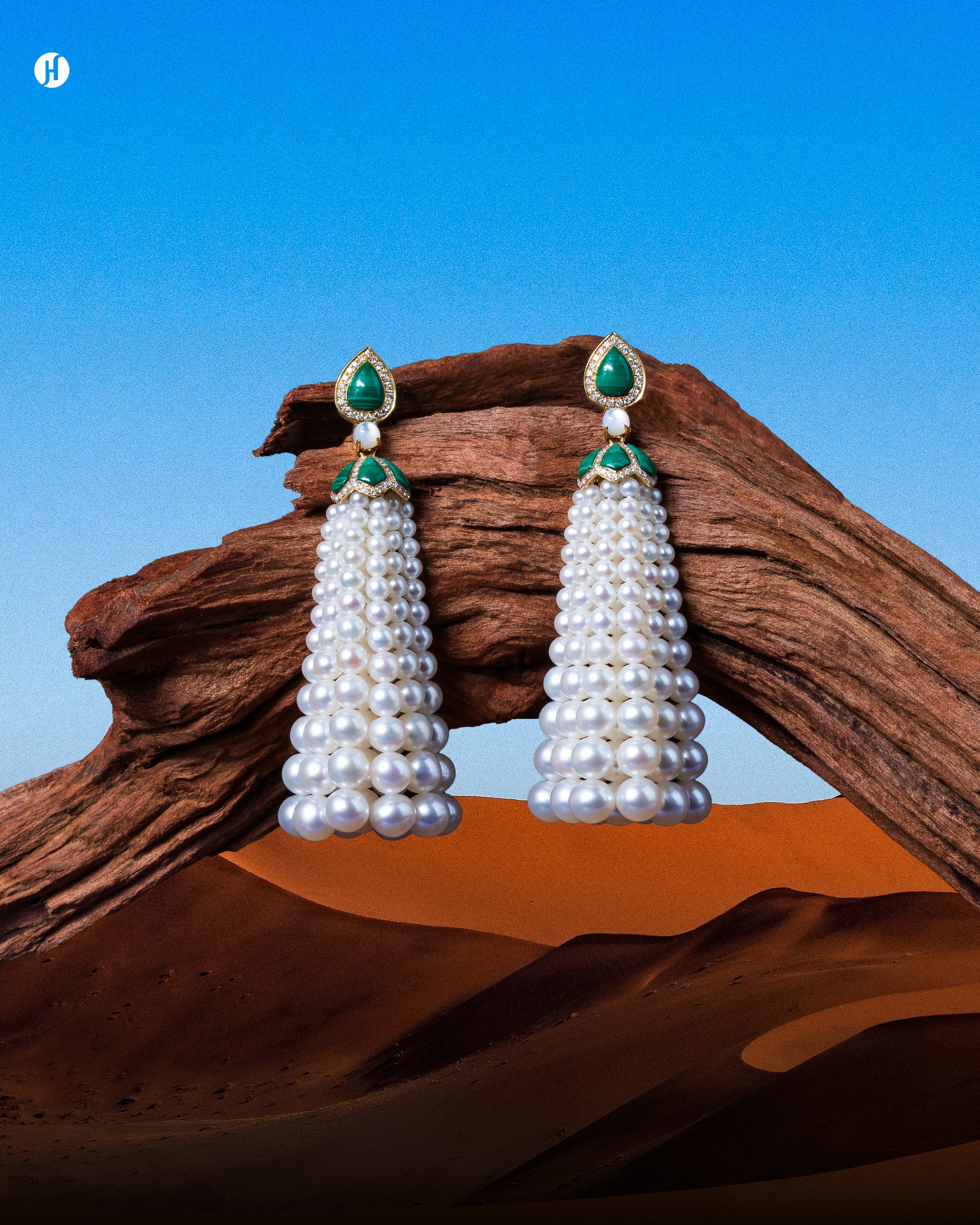 This 18Karat yellow gold luxurious diamond and pearl necklace set features a teardrop-inspired design adorned with vibrant malachite stones and shimmering diamond accents. The pendant is complemented by cascading strands of lustrous freshwater pearls, creating a dramatic tassel effect. Matching earrings mirror the pendant’s elegance, completing the look with timeless charm.