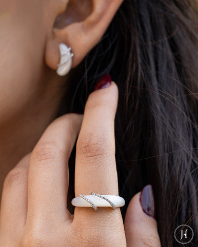 THis 18K yellow gold white mother of pearl diamond earrings ring set diamond earrings come with a matching statement ring. The c-hoop style earrings fasten with pushbacks.