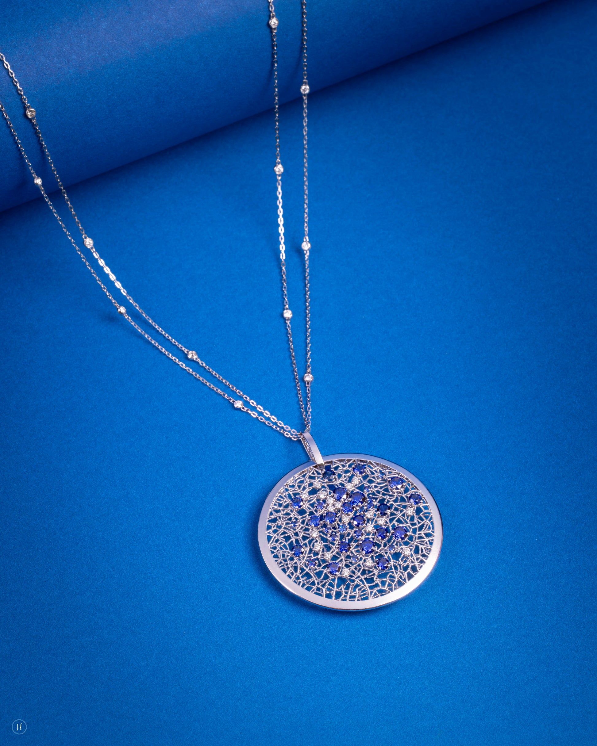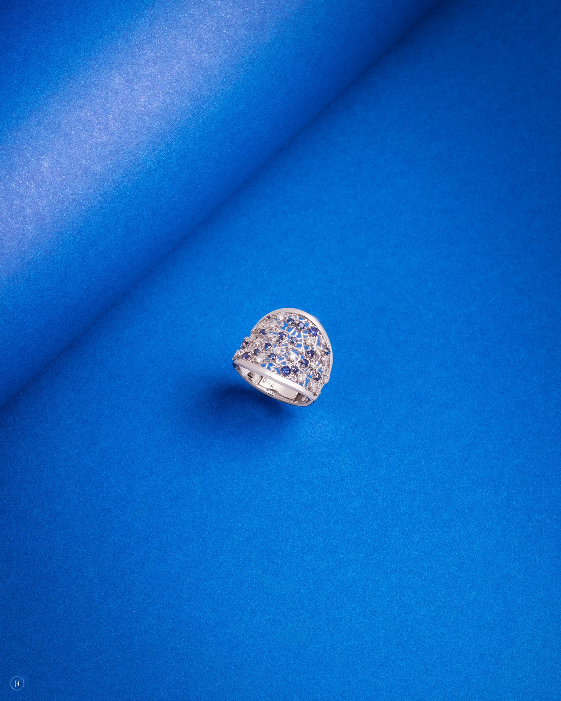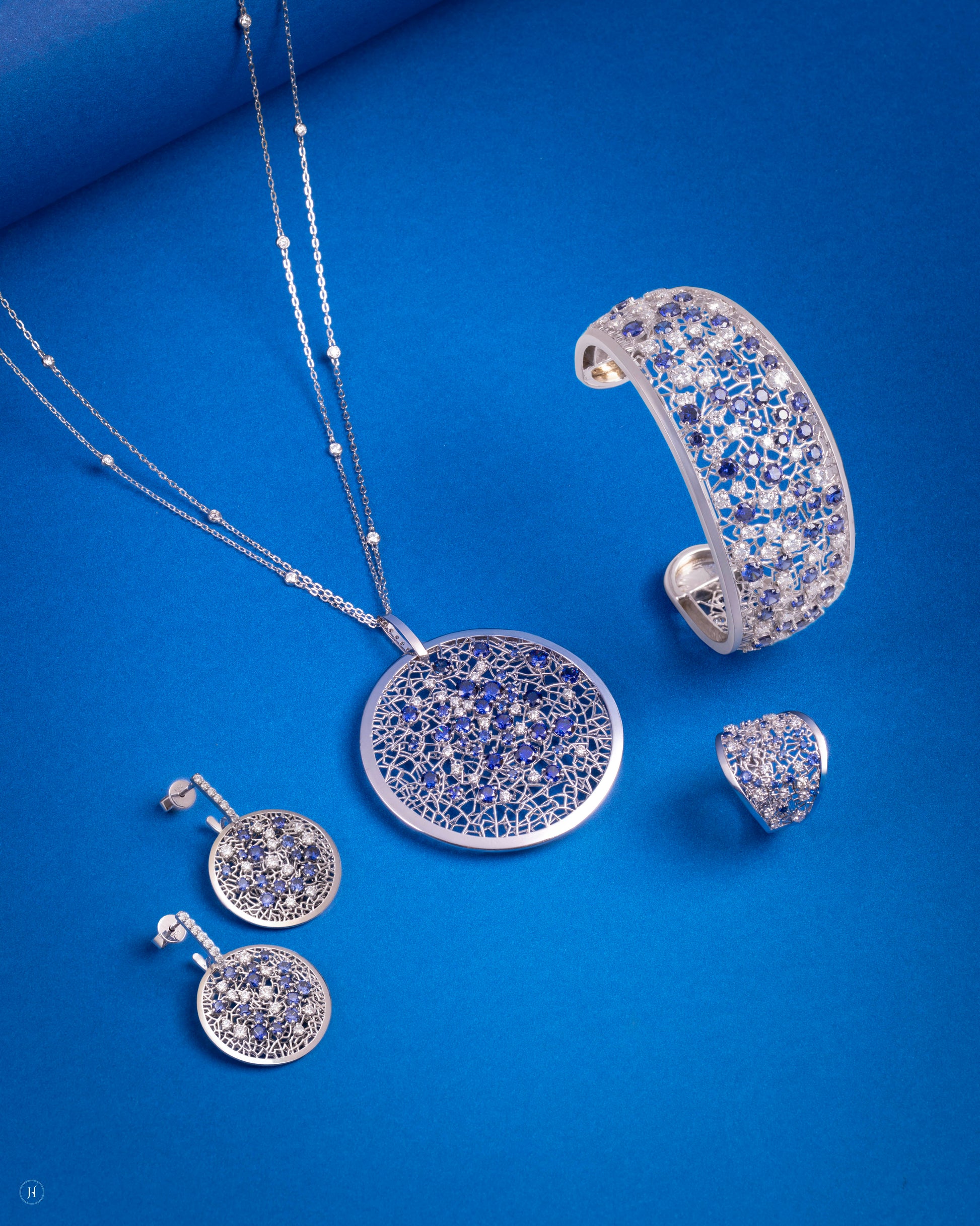 This luxurious 18Karat Italian jewelry set from our unique Aniq collection is crafted in white gold and features a blossom mosaic design inspired by floral lace. Adorned with deep blue sapphire stones and zircon accents, the set includes a round pendant necklace, a bold dome ring, and a wide cuff bracelet.