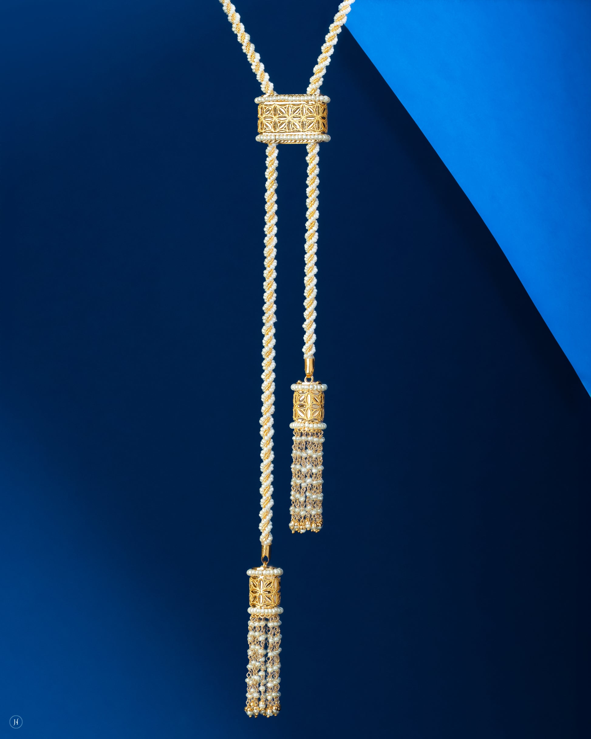 This 21K yellow gold Bahraini necklace set features a dual tassel drop pendant. The necklace is complemented by matching drop earrings, crafted with pearls work.