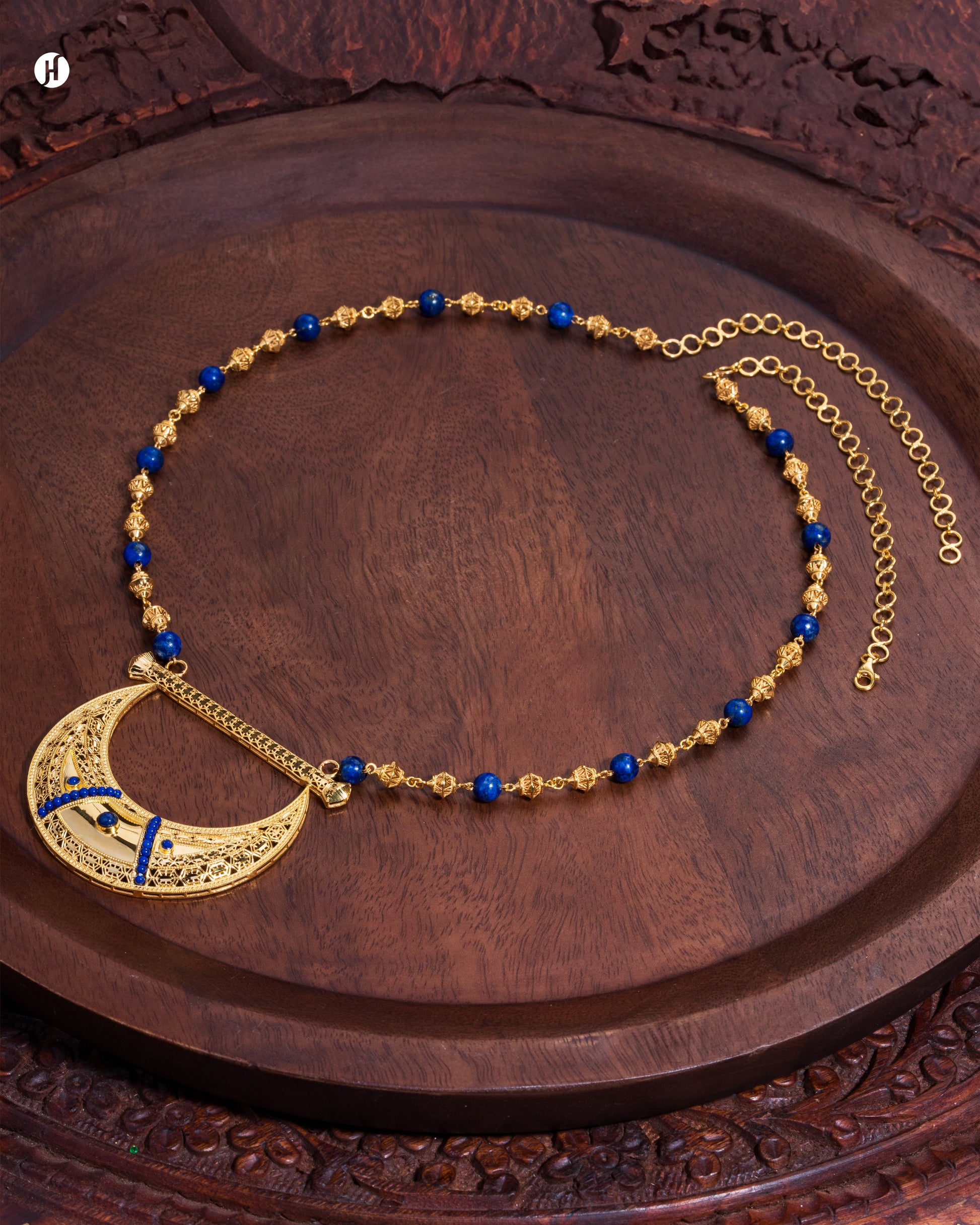 This 21Karat yellow gold traditional Bahraini necklace set features crescent pendant with blue lapis gemstone details. The opera-length necklace fastens with a lobster clasp and is accompanied by matching push-back drop earrings and a ring.
