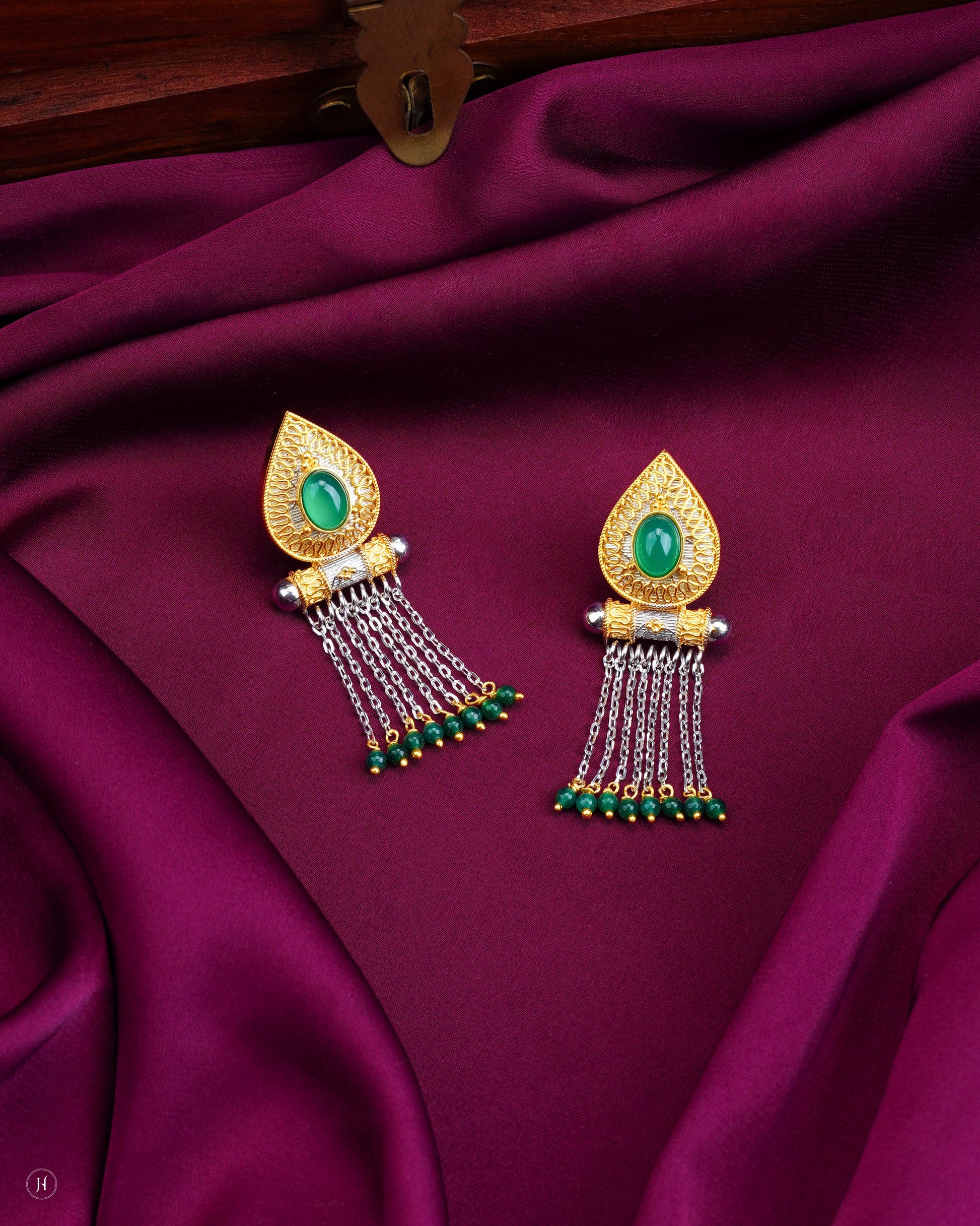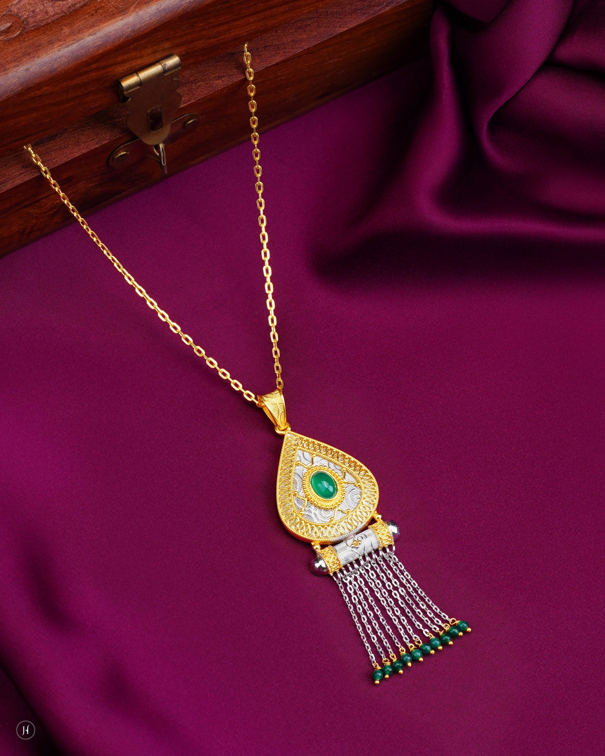 This 21-Karat yellow gold Bahraini jewelry set features a striking teardrop-shaped pendant with a emerald stone at the center. The matching earrings mirror the teardrop motif, while delicate white gold tassel chains tipped with emerald and golden beads.