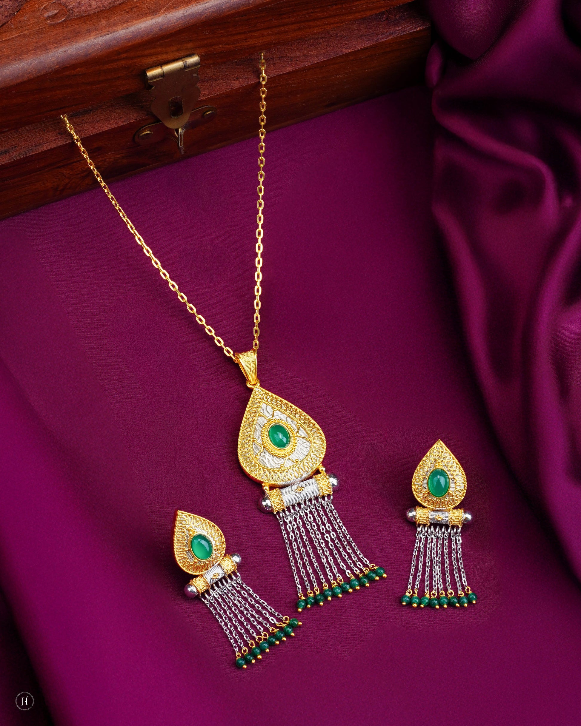 21K Yellow Gold Bahraini Emerald Teardrop Tassel Necklace Set