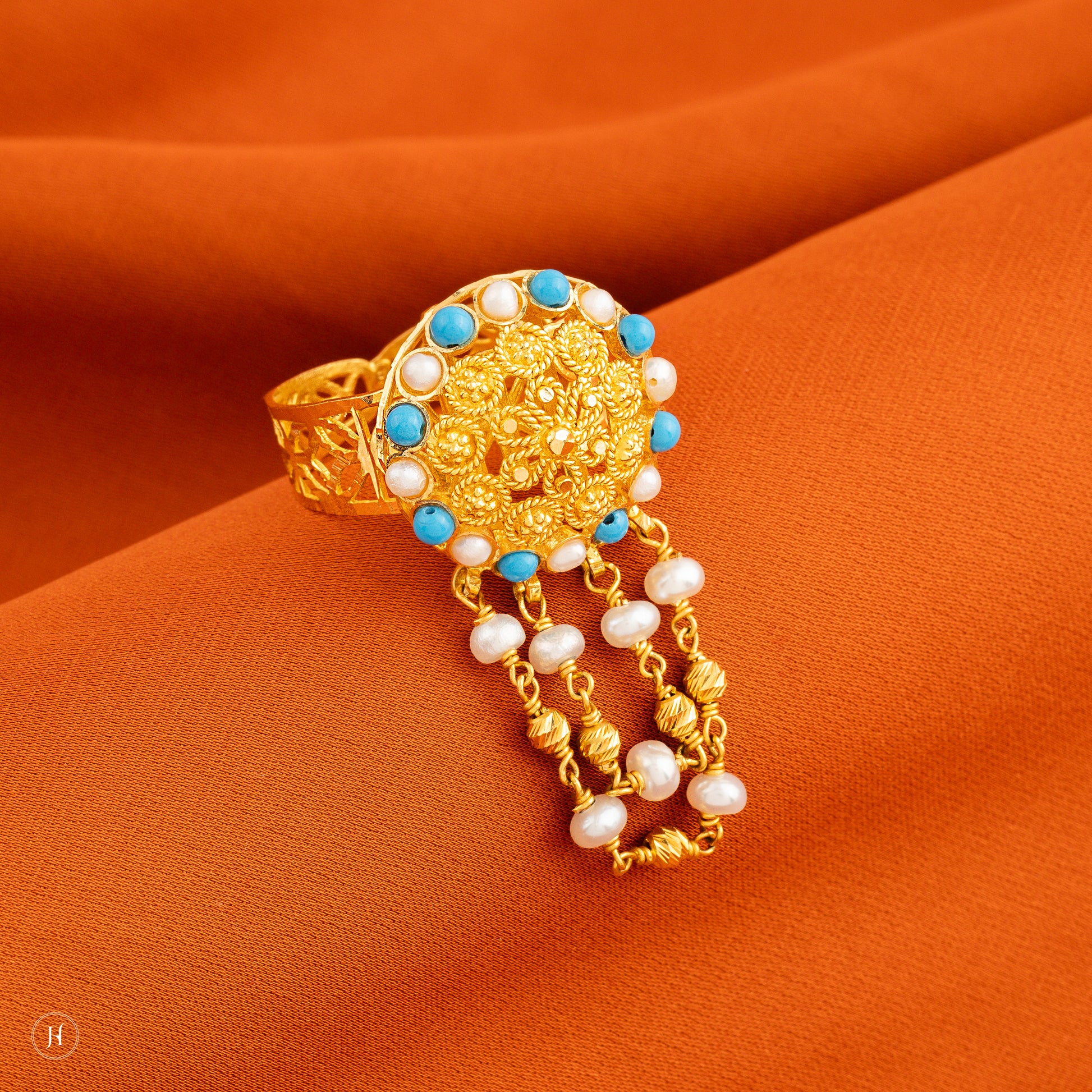 This 21K yellow gold florals Bahraini traditional ring bordered by pearls and turquoise. This ring is a luxurious statement piece, perfect for special traditional occasions.