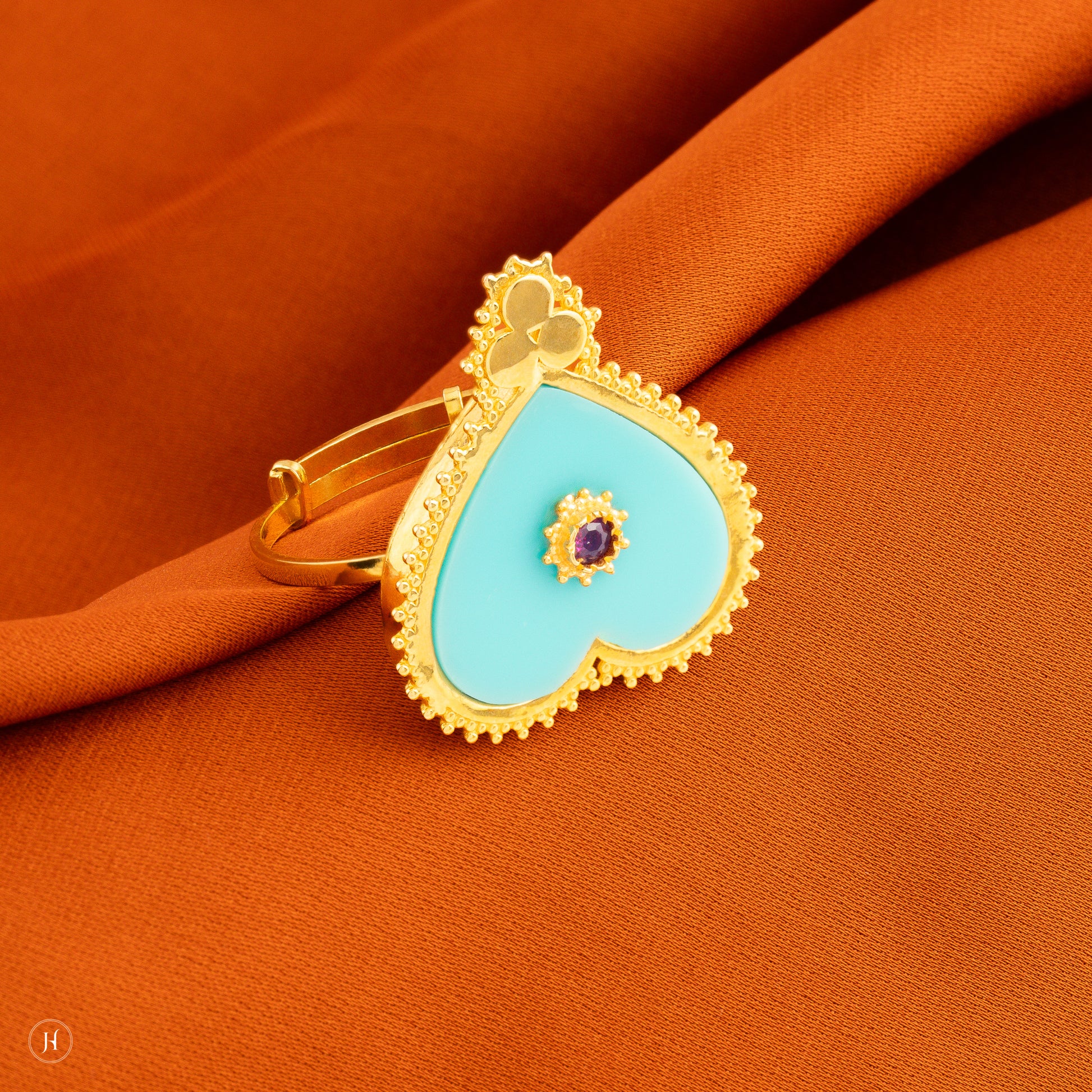 This 21K yellow gold Bahraini love ring features a ruby center stone in blue enamel. This ring is a luxurious statement piece for special occasions and perfect gift for your loved one.