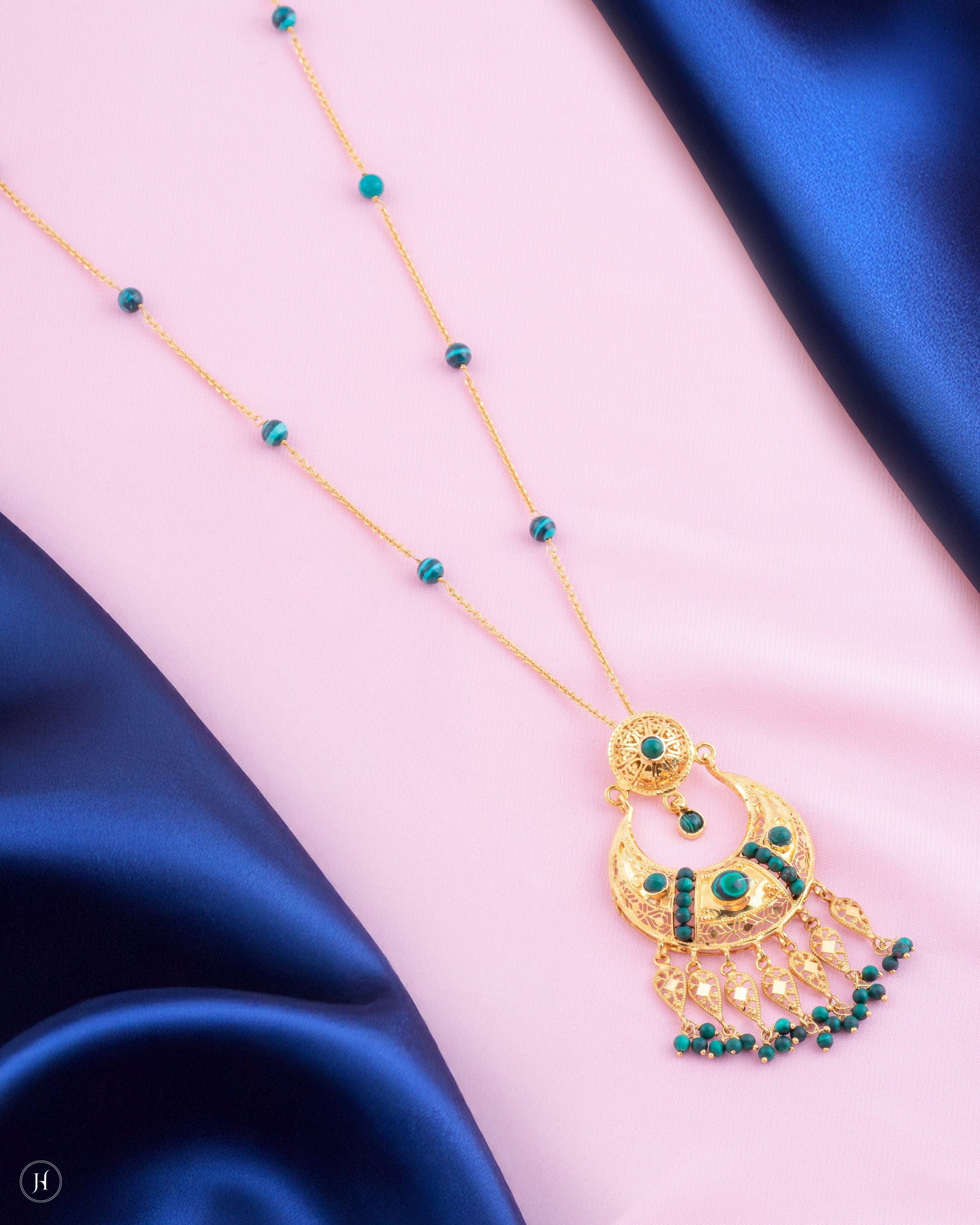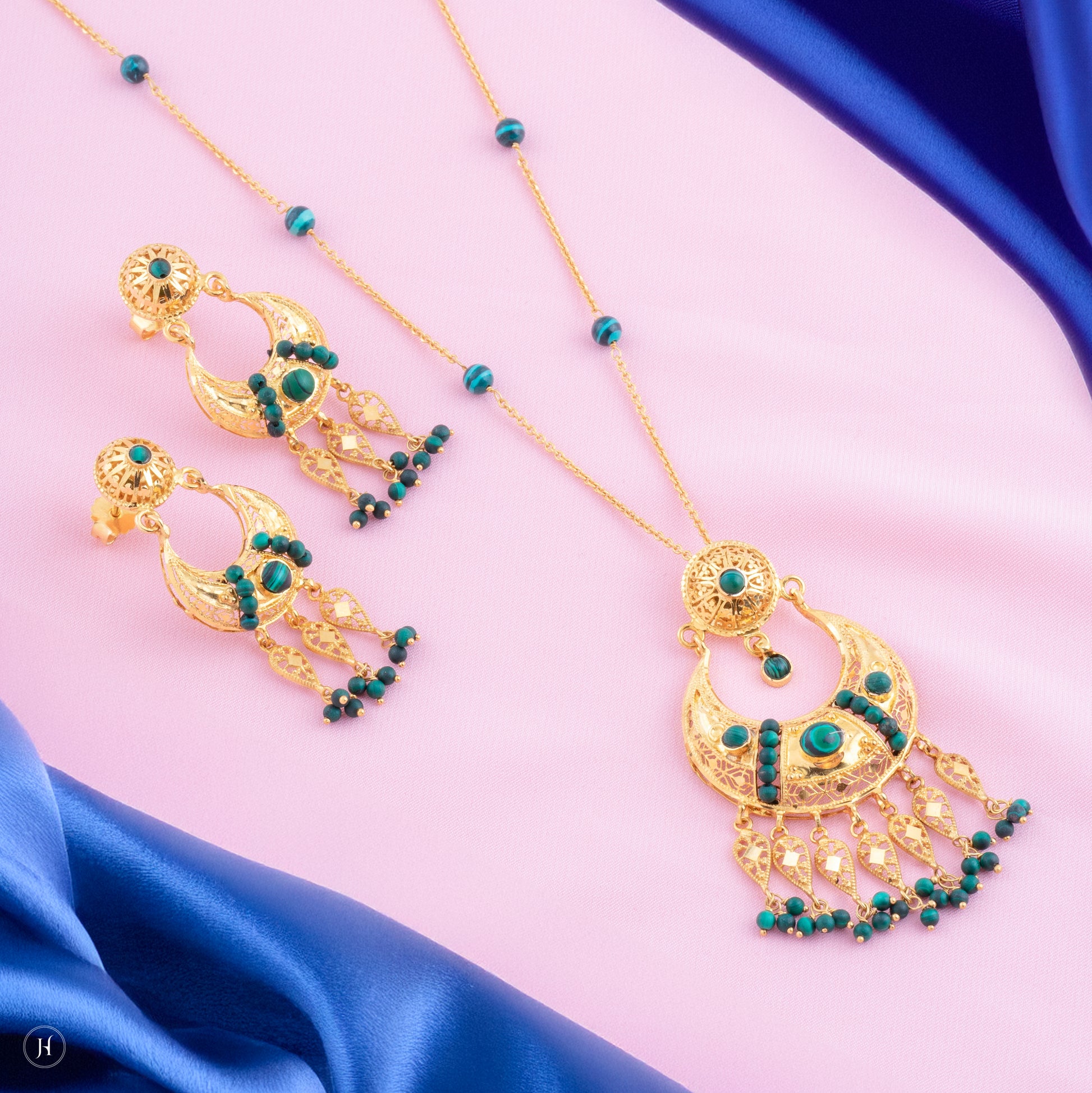 21K Yellow Gold Bahraini Malachite Crescent Moon Necklace Set