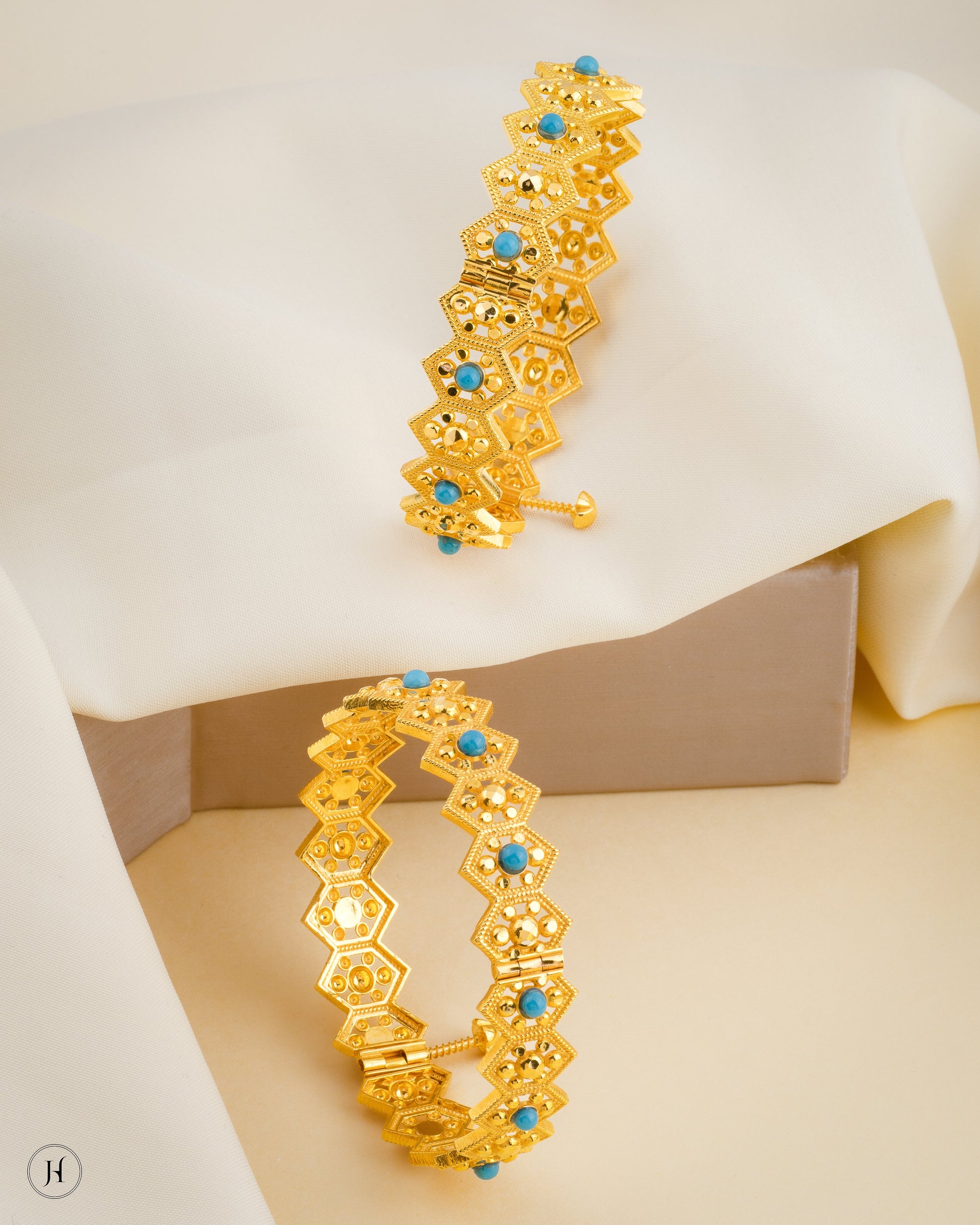 This 21K yellow gold Bahraini bangles set features beading with turquoise stones. These bangles are secured with a screw lock.