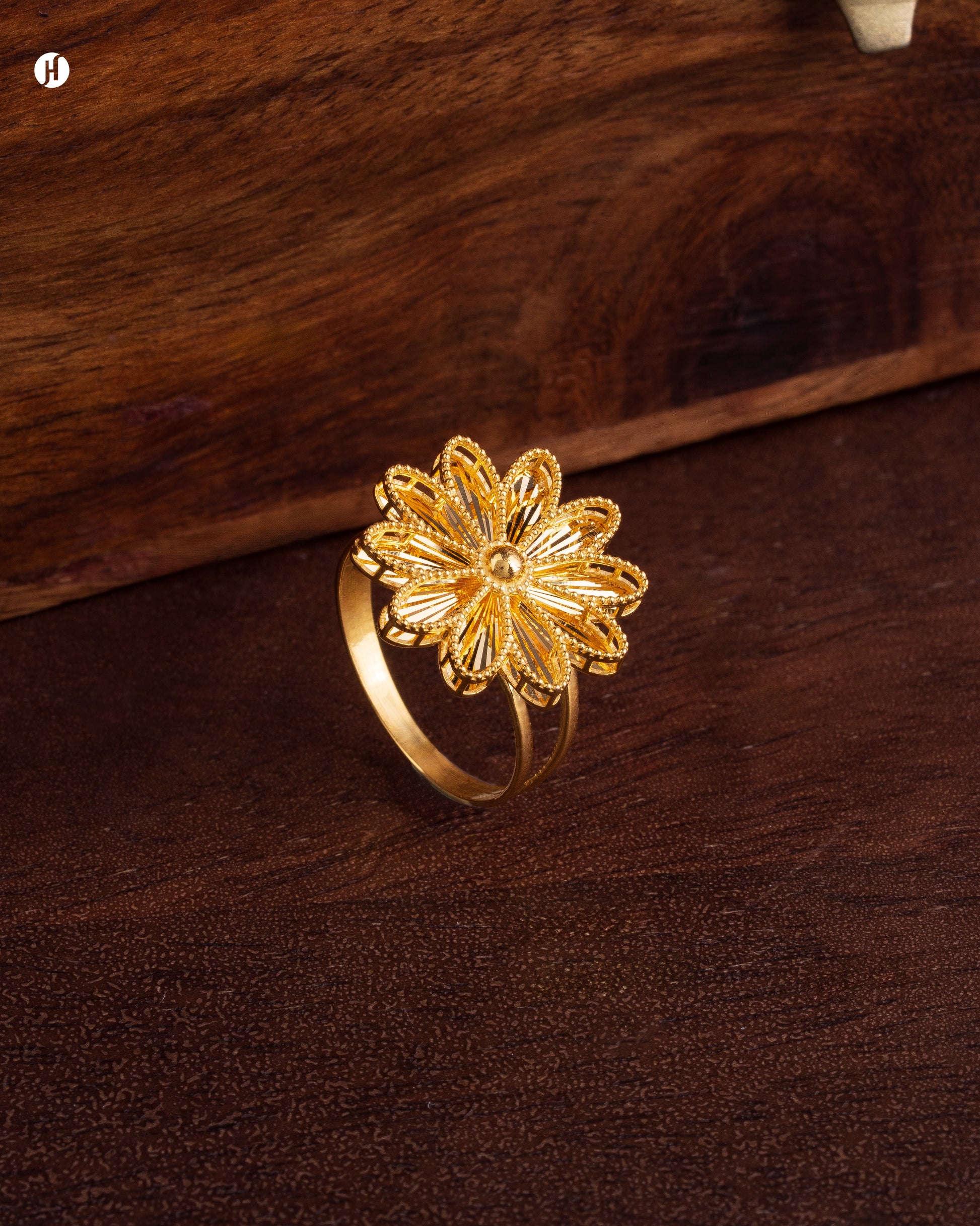 This 21Karat yellow gold flower design necklace set features seven flower pendant. The set also includes matching drop earrings, ring and bracelet with lobster clasp.