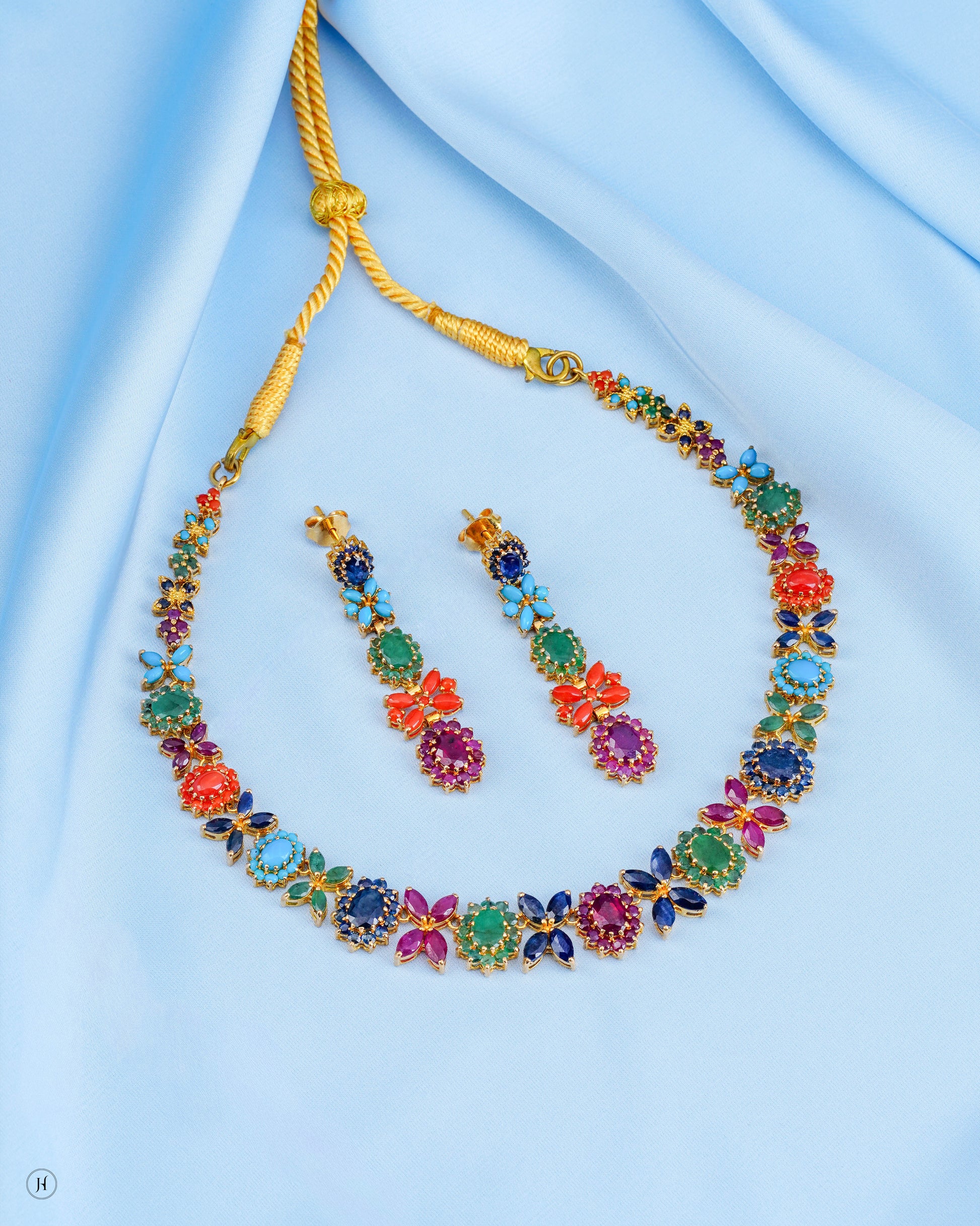 This 21Karat yellow gold prince necklace set features ruby-red, sapphire-blue, emerald-green and turquoise in multi flower shape with adjustable lobster closure. The set is complemented by matching pushback drop earrings.