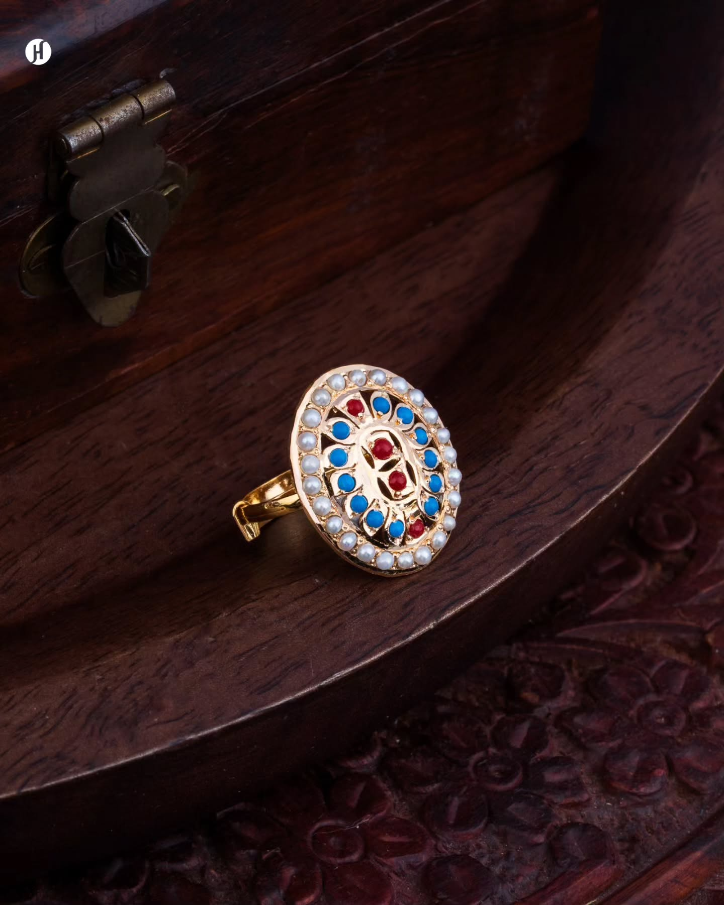 This 21karat yellow gold traditional opera necklace features a round layered circular design highlighted with red and turquoise blue stone detailing, bordered with freshwater pearl accents surrounding the pendant, with pearl drop detailing adding graceful movement, accompanied by matching earrings secured with stud lock and a coordinating ring.