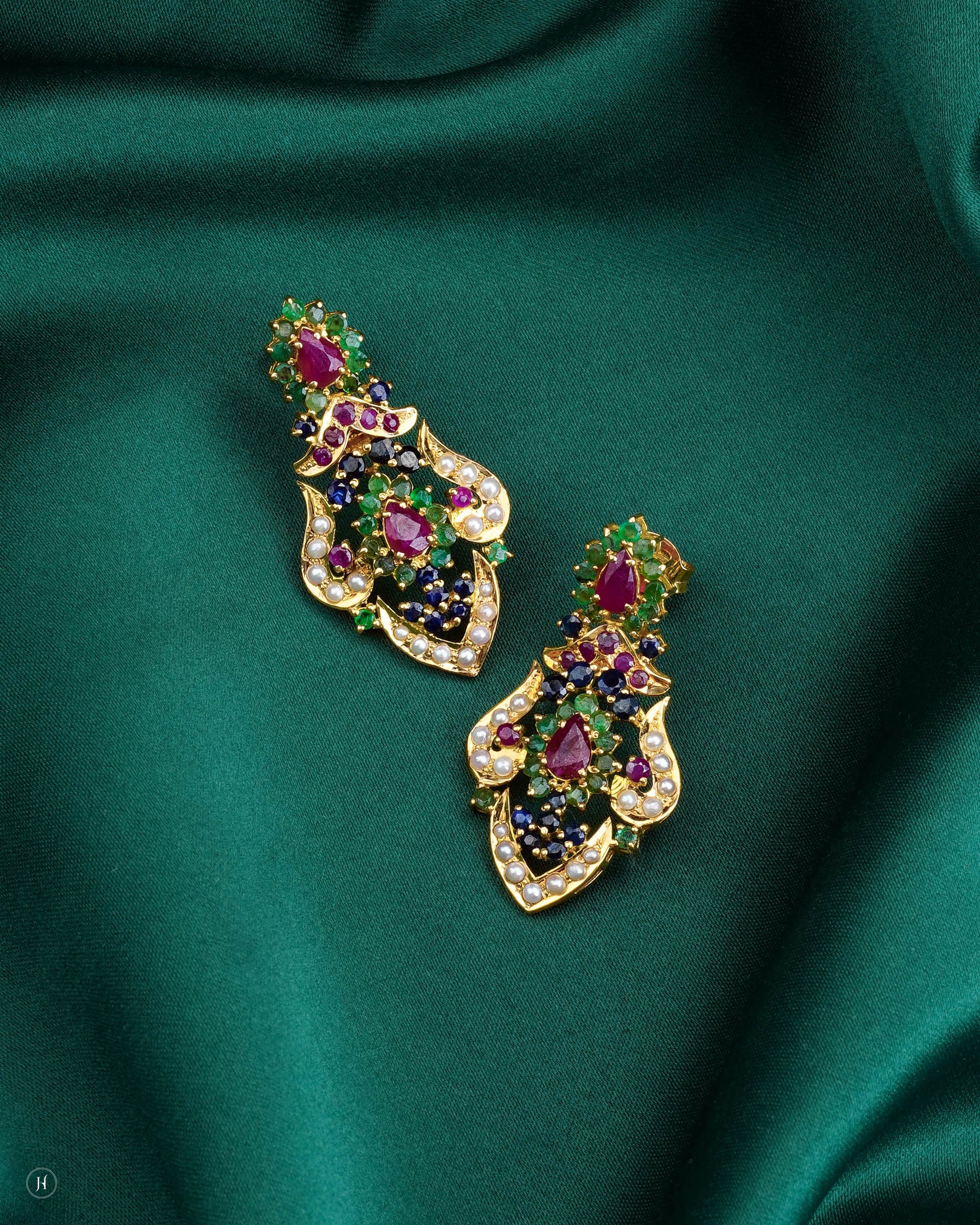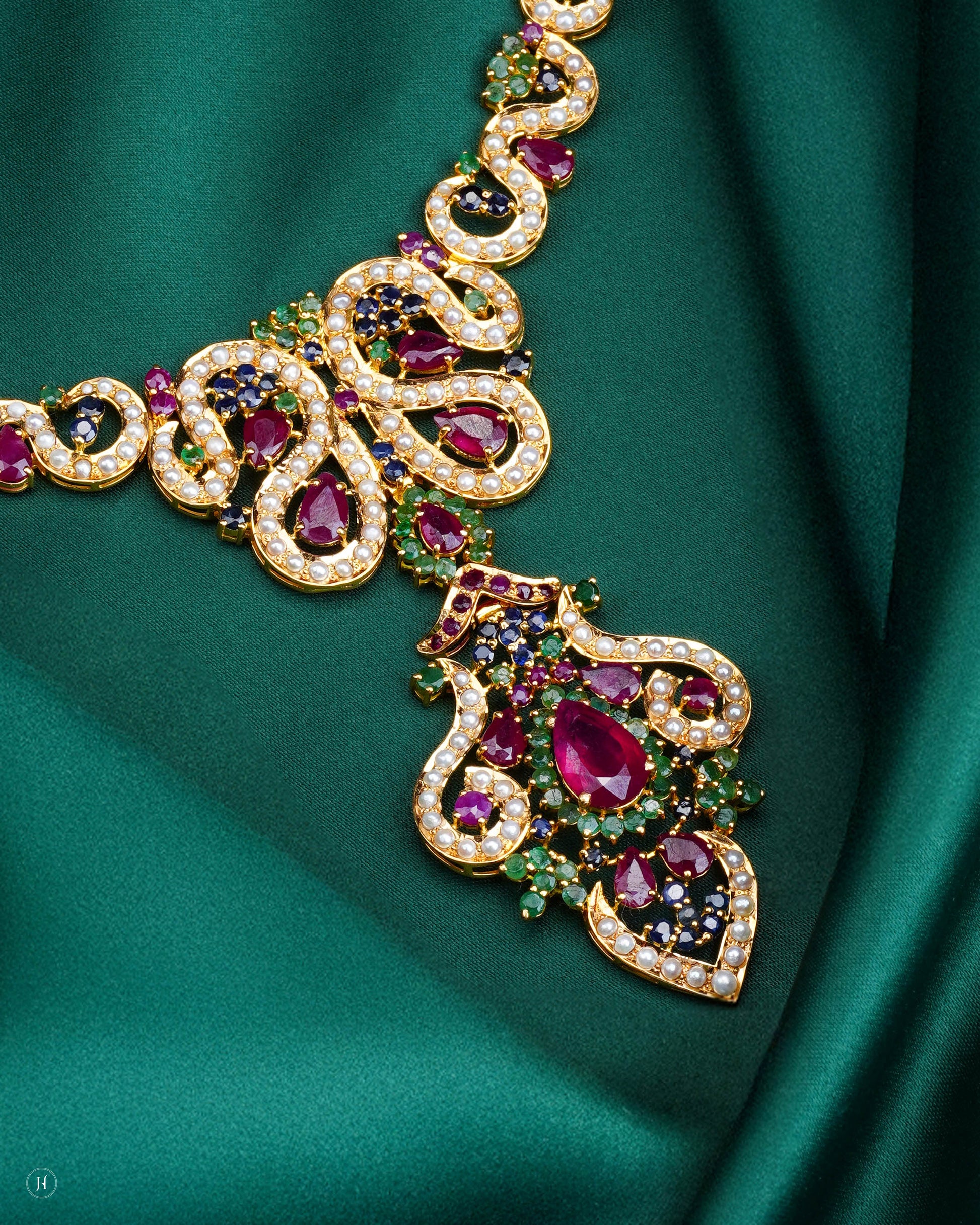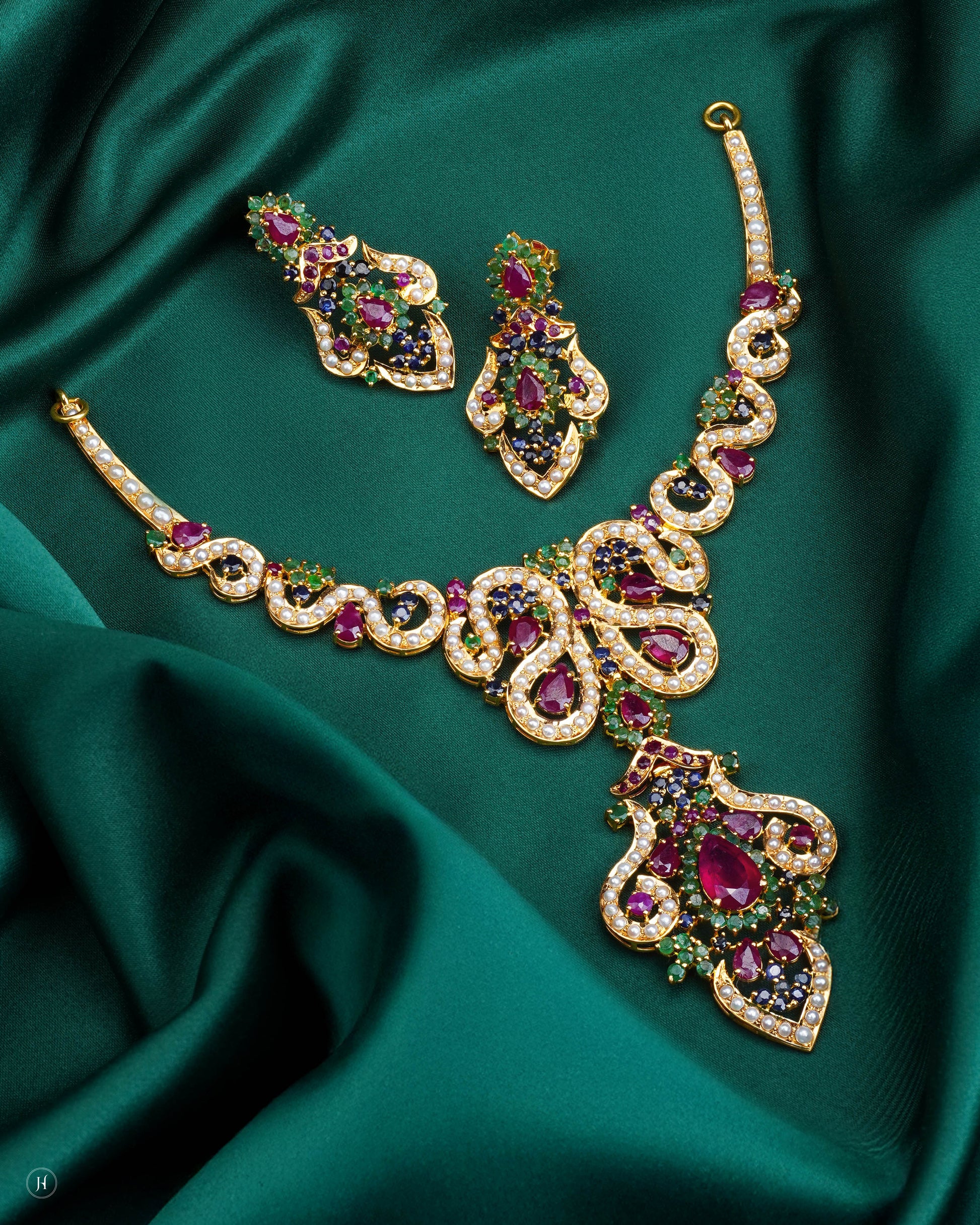This 21K yellow gold Pakistani jewelry set features an ornate design adorned with vivid rubies, emeralds, sapphires, and sparkling zircons. The necklace showcases an elaborate teardrop ruby centerpiece framed with pearls, while the matching earrings echo the same royal design.