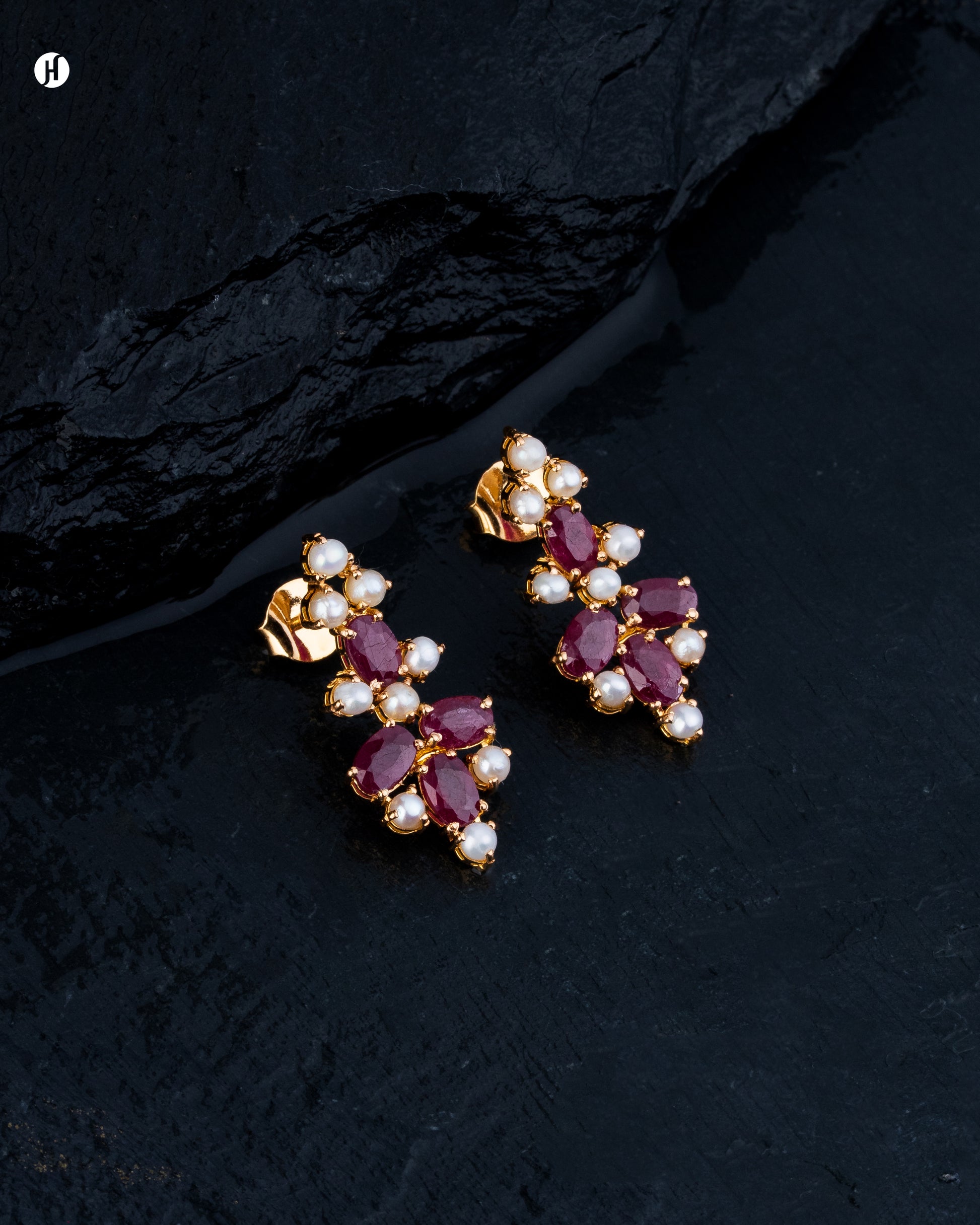 This 21Karat yellow gold necklace set features a oval-link design adorned with ruby and freshwater pearls. The is accompanied by matching drop earrings.