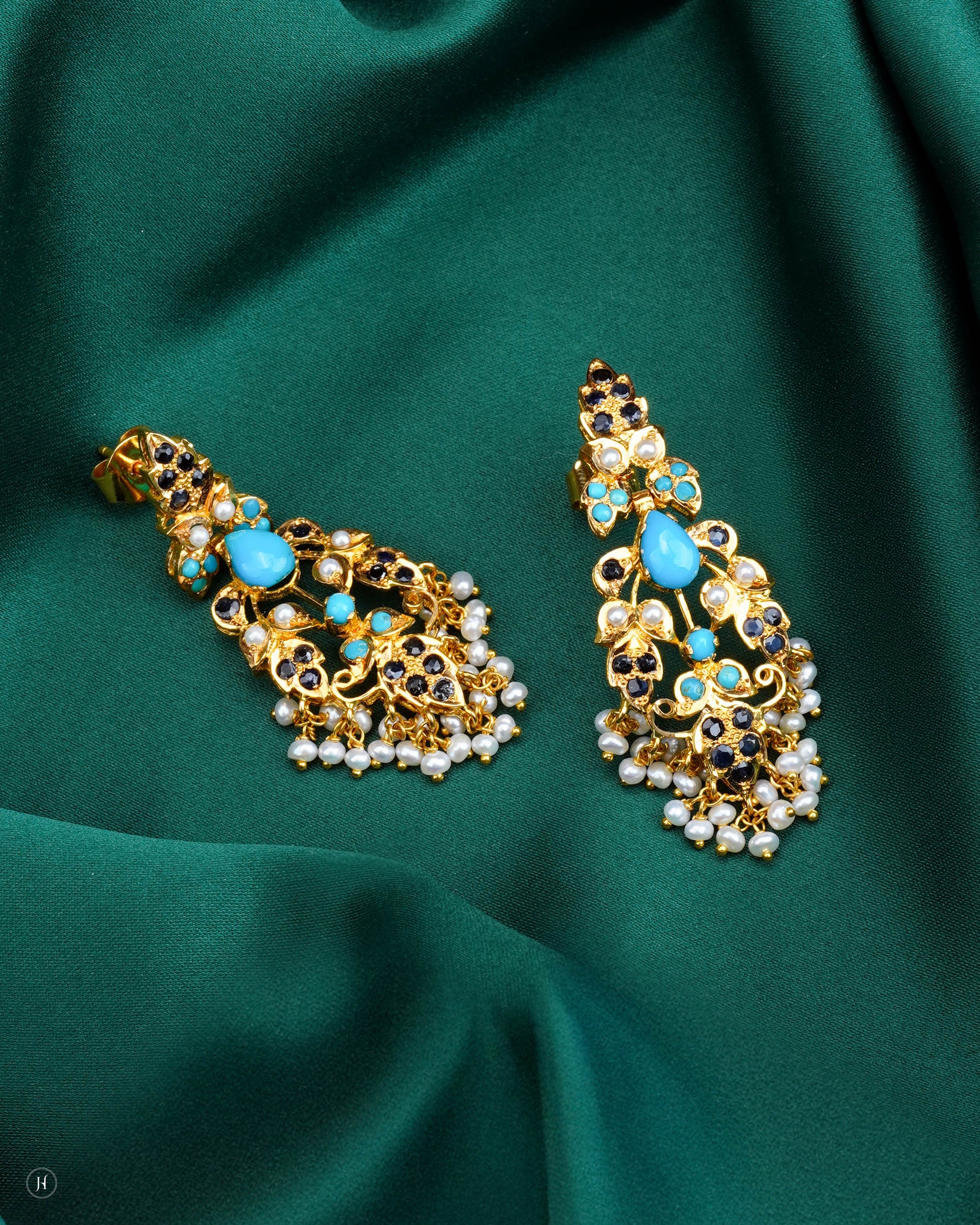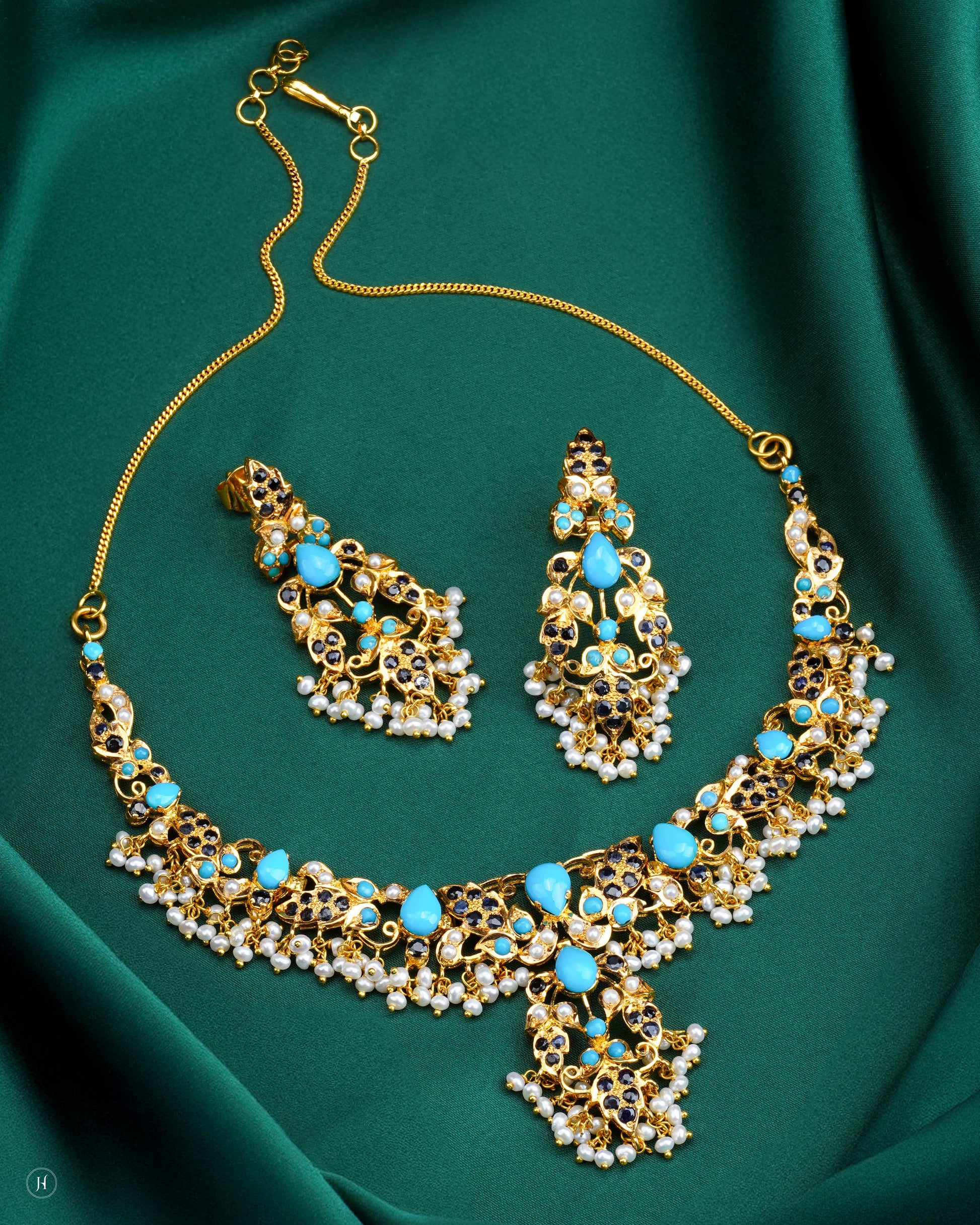 21K Yellow Gold Pakistani Turquoise & Pearl Floral Necklace Set