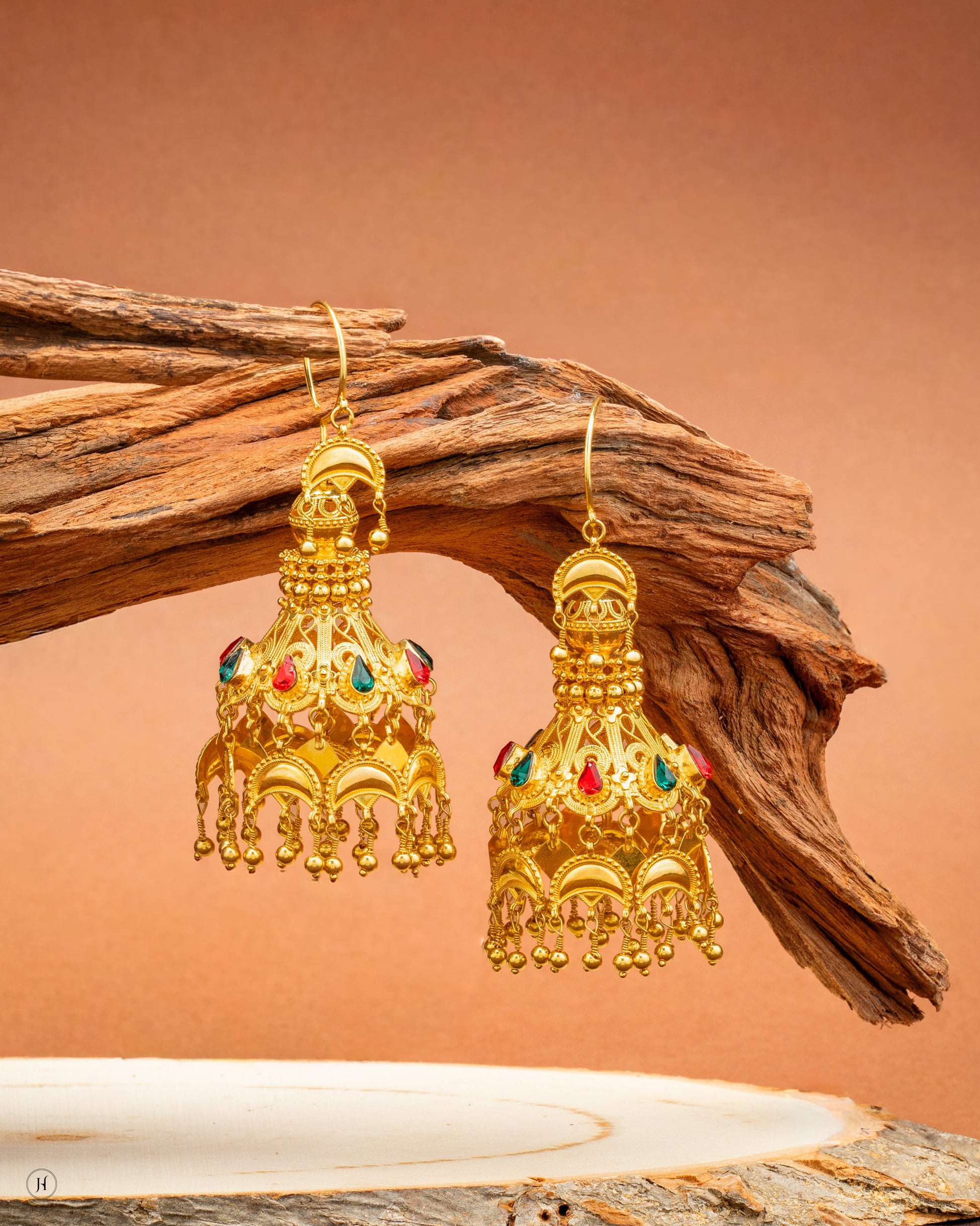 These 21K yellow gold Bahraini mudallah earrings feature a classic dome design decorated with minimal ruby & emerald stones. The hanging gold beads with crescent shape adds beauty. A perfect choice for everyday Khaleeji wear or gifting, bringing a bright and elegant look to any outfit.