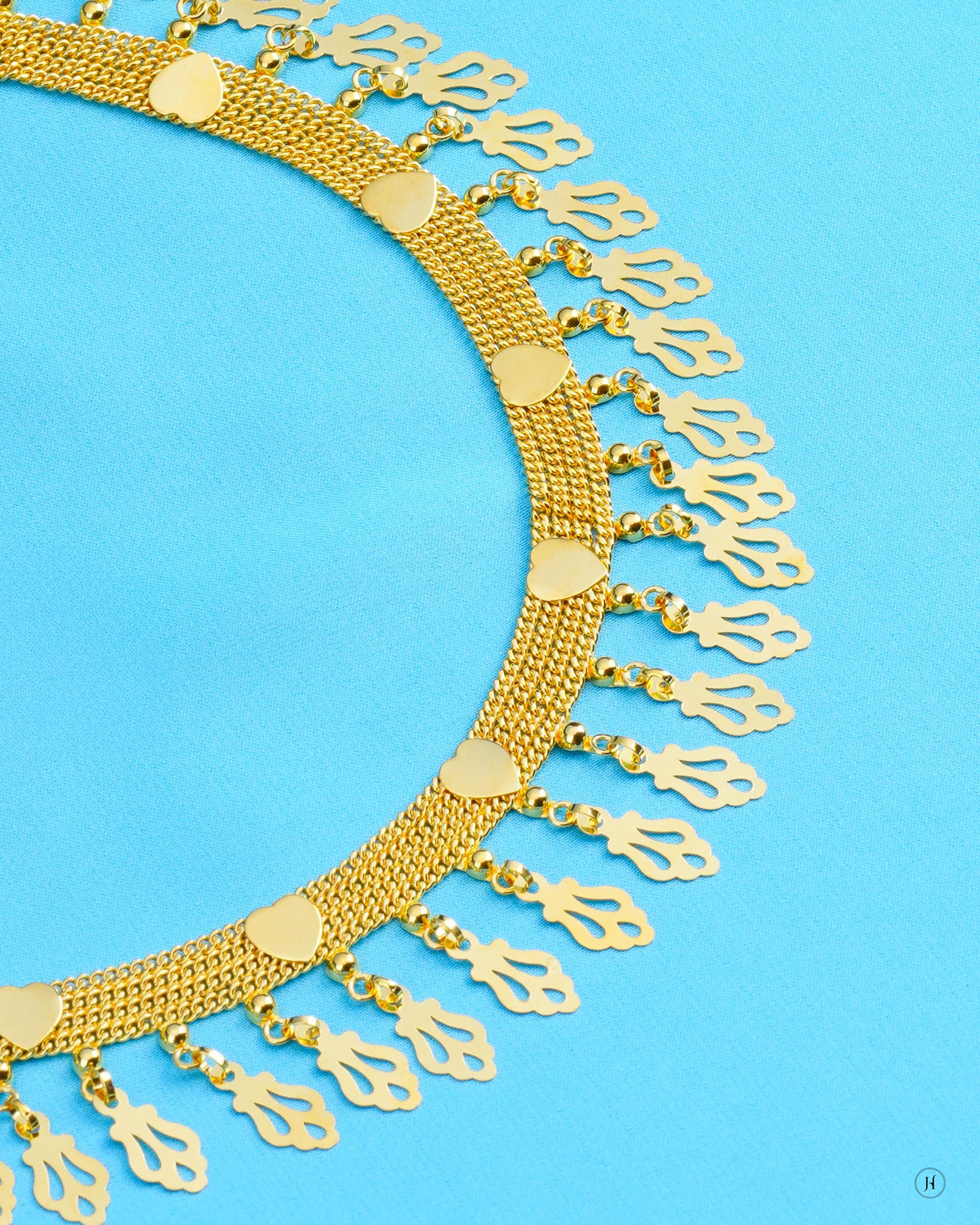This 21Karat yellow gold Bahraini necklace features a bold choker-style design, adorned with cut drop-shaped motifs that dangle gracefully along the lower edge. The necklace is with polished round gold chain-work. The set is completed with matching drop earrings.
