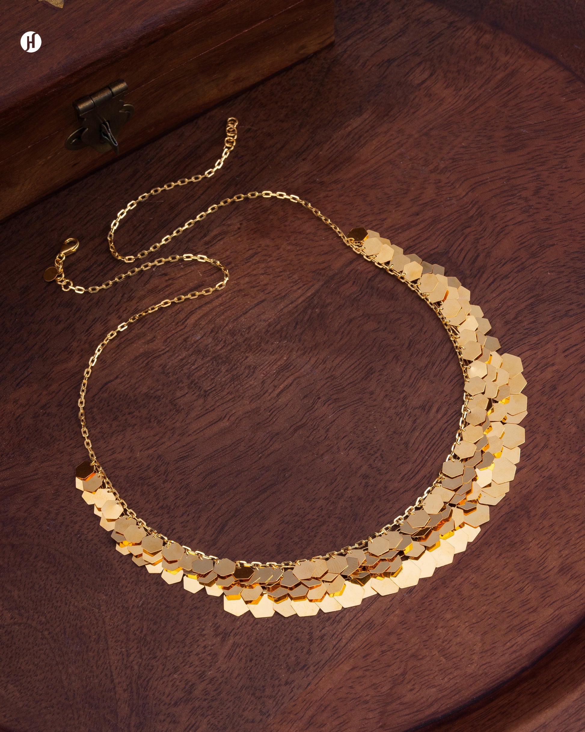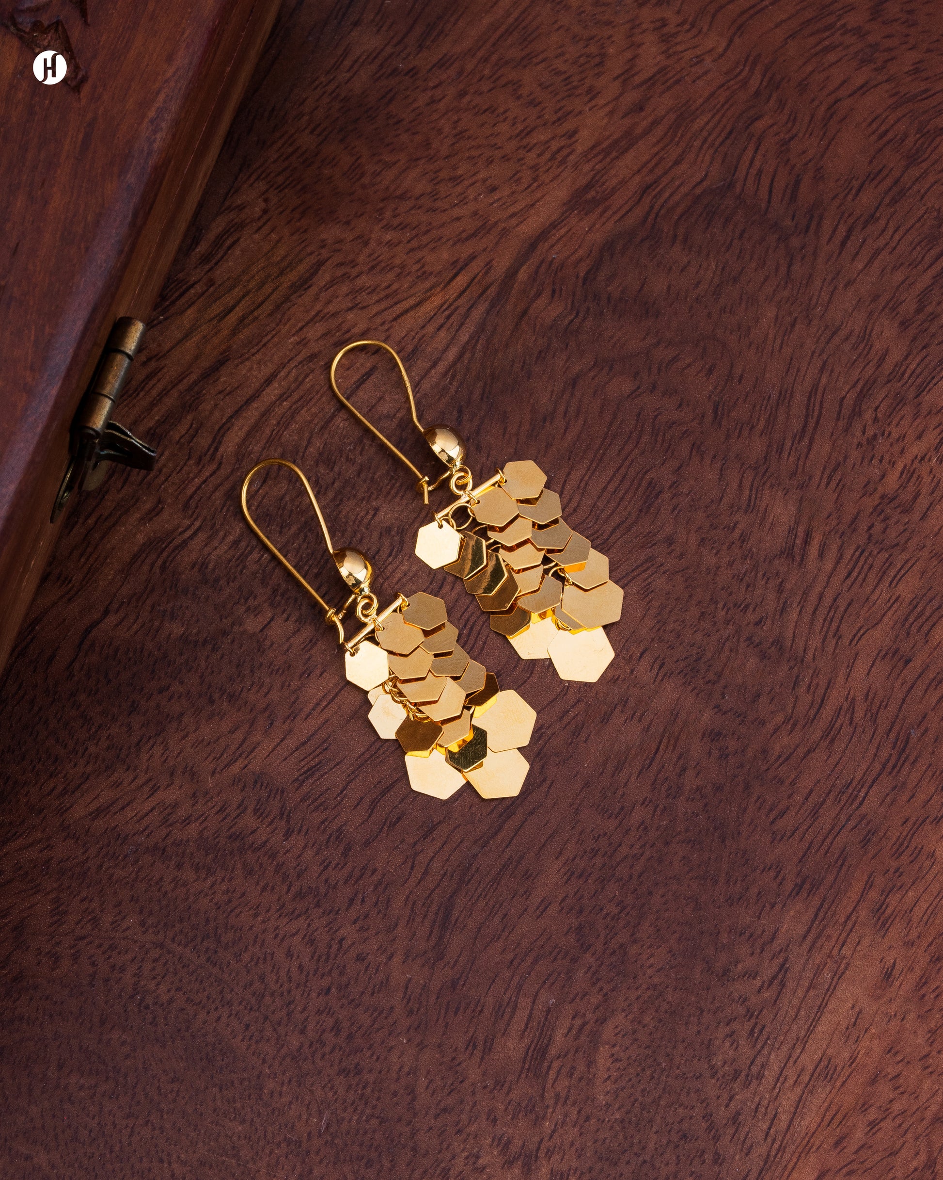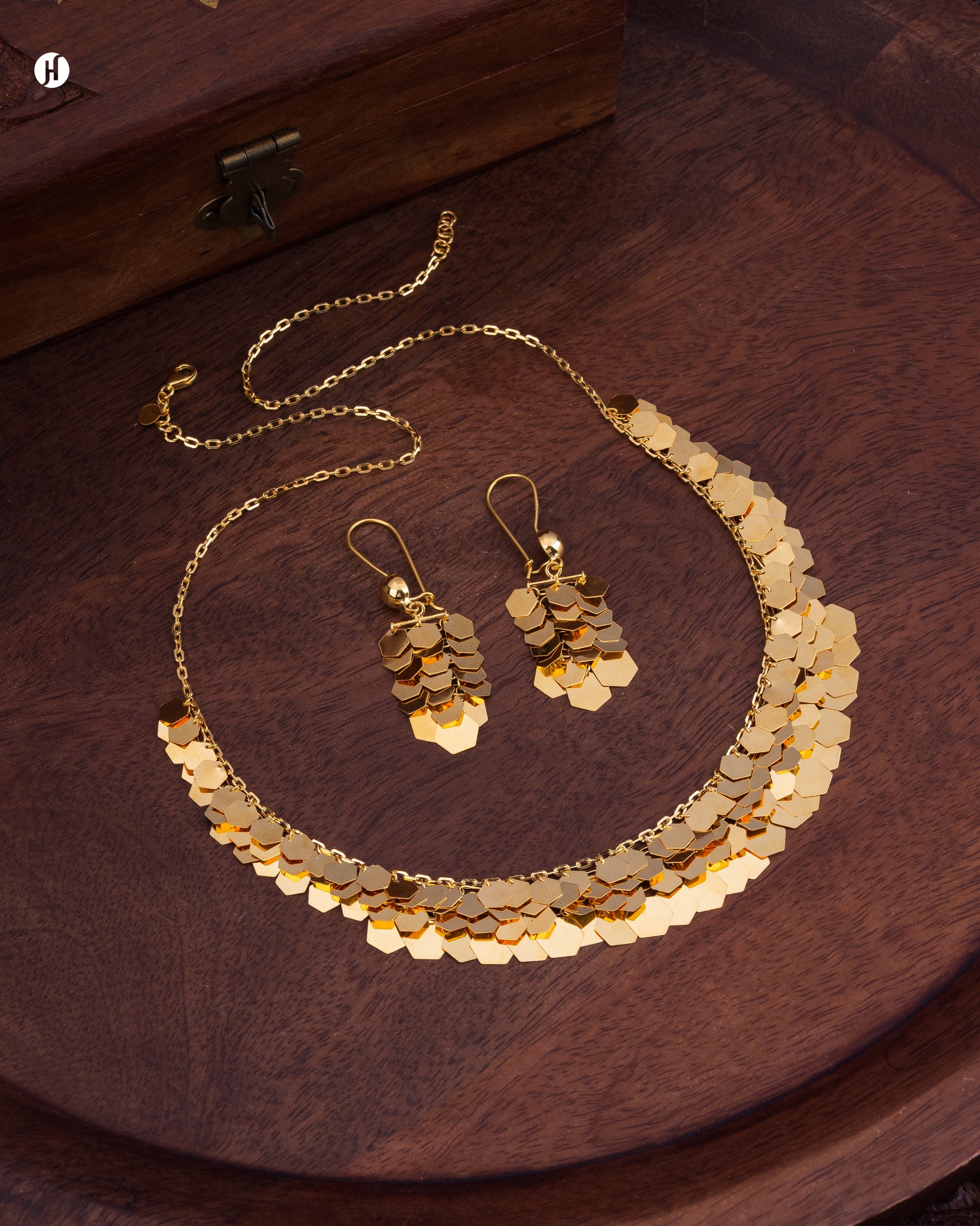 This 21K yellow gold jewellery set features a hexagon design crafted with polished hexagonal motifs. The necklace showcases cascading layers of reflective gold pieces. Paired with matching drop earrings.