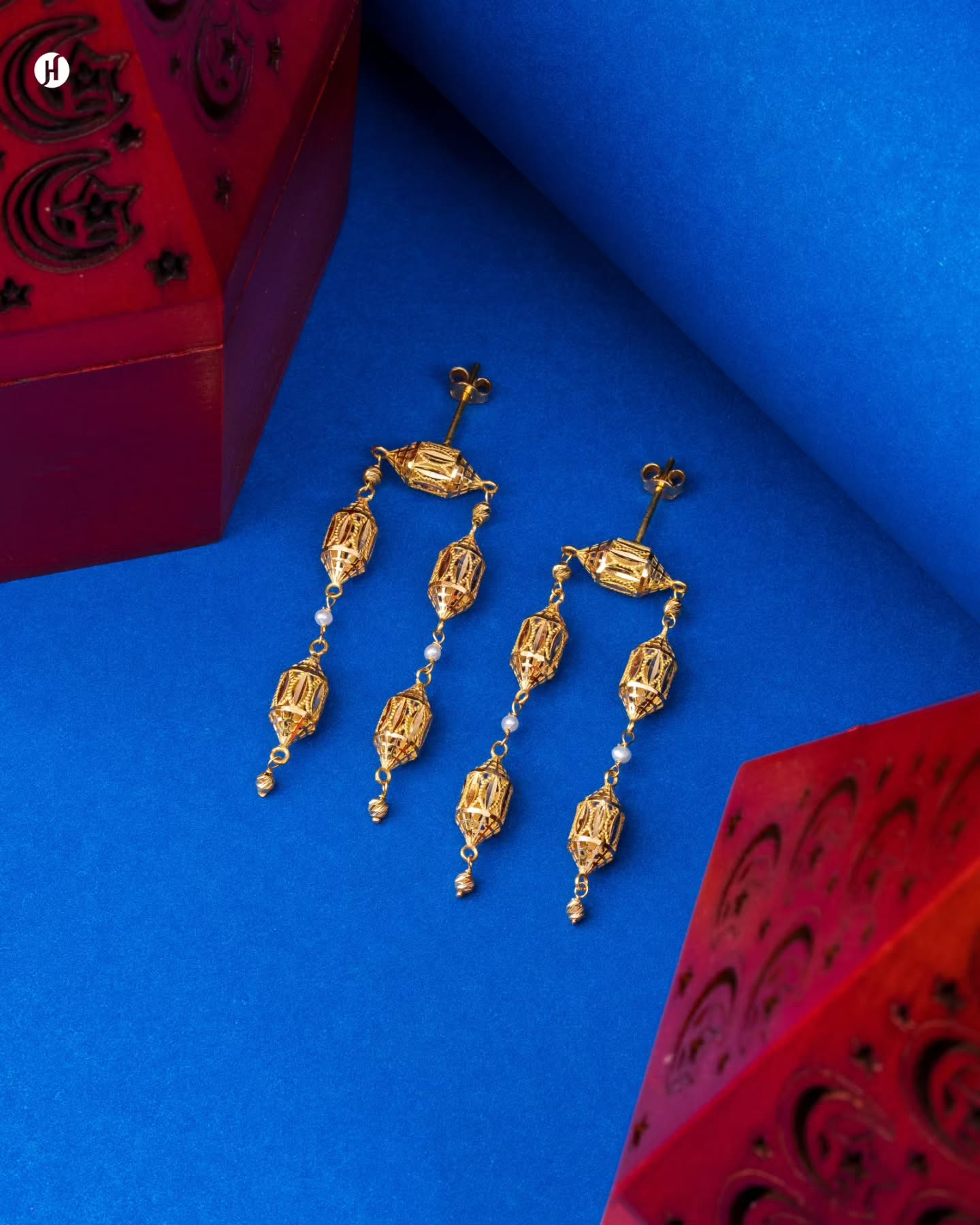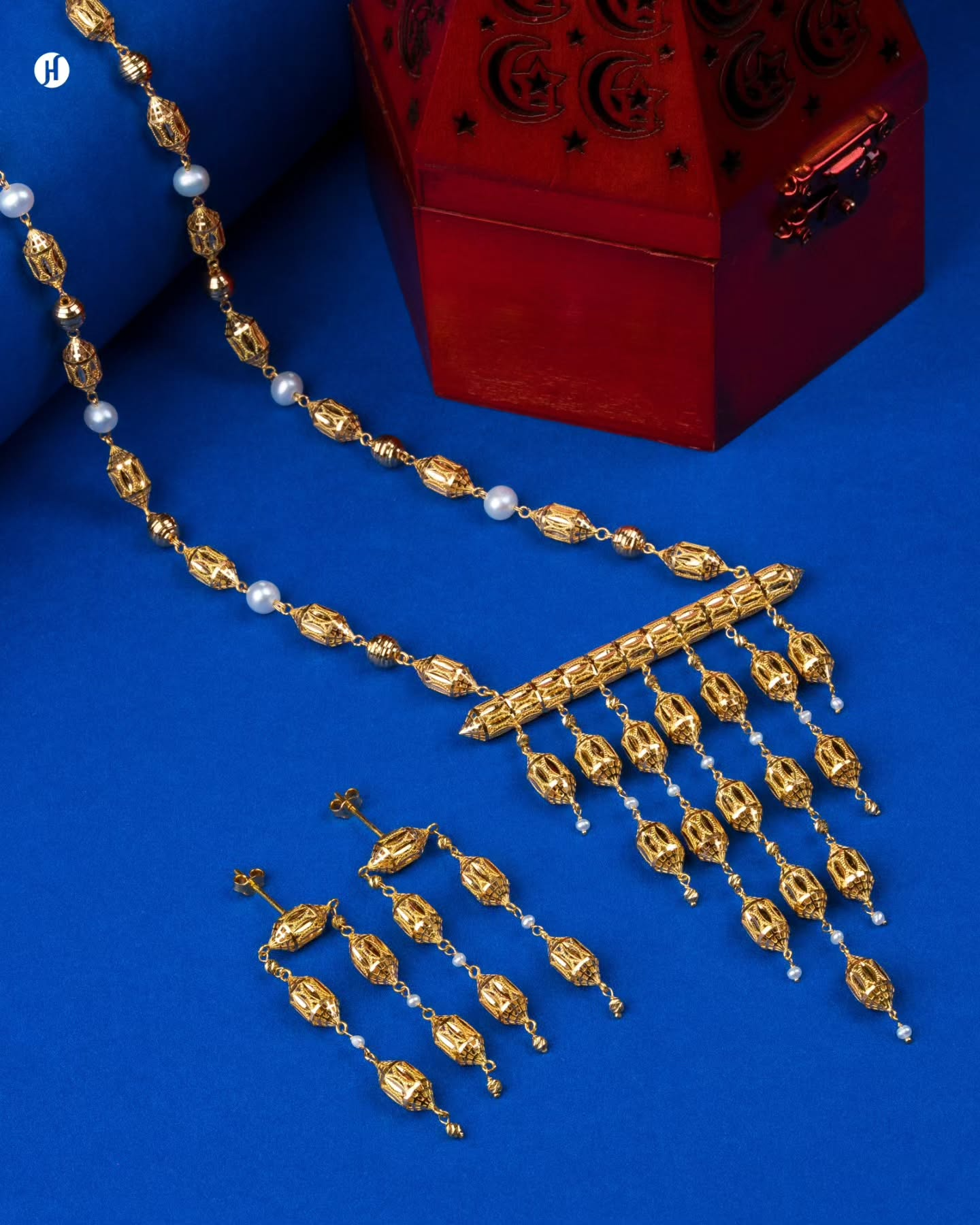 This 21K yellow gold Bahraini jewelry set features lantern-shaped bead motifs accented with freshwater pearls. The necklace showcases a bold horizontal pendant with cascading bead hangings, complemented by matching chandelier earrings.