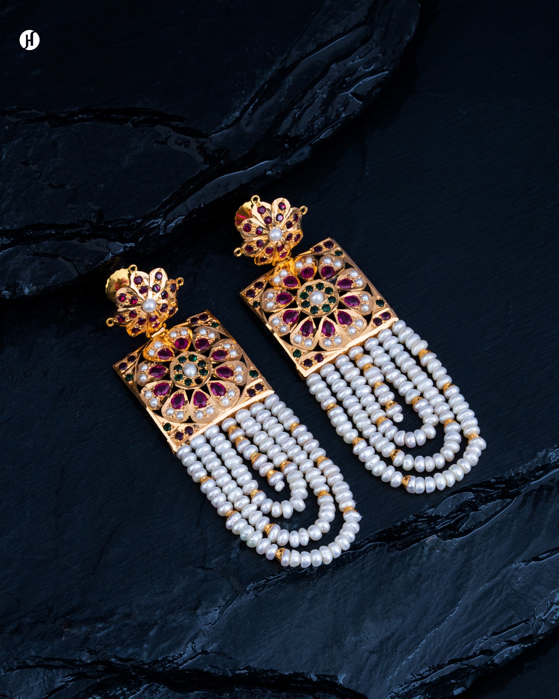 This 21Karat Pakistani necklace set features a multi-layer cascade of fine white pearls accented with dainty gold beads. The matching earrings, and ring with the same ruby-floral detailing and pearl strands.