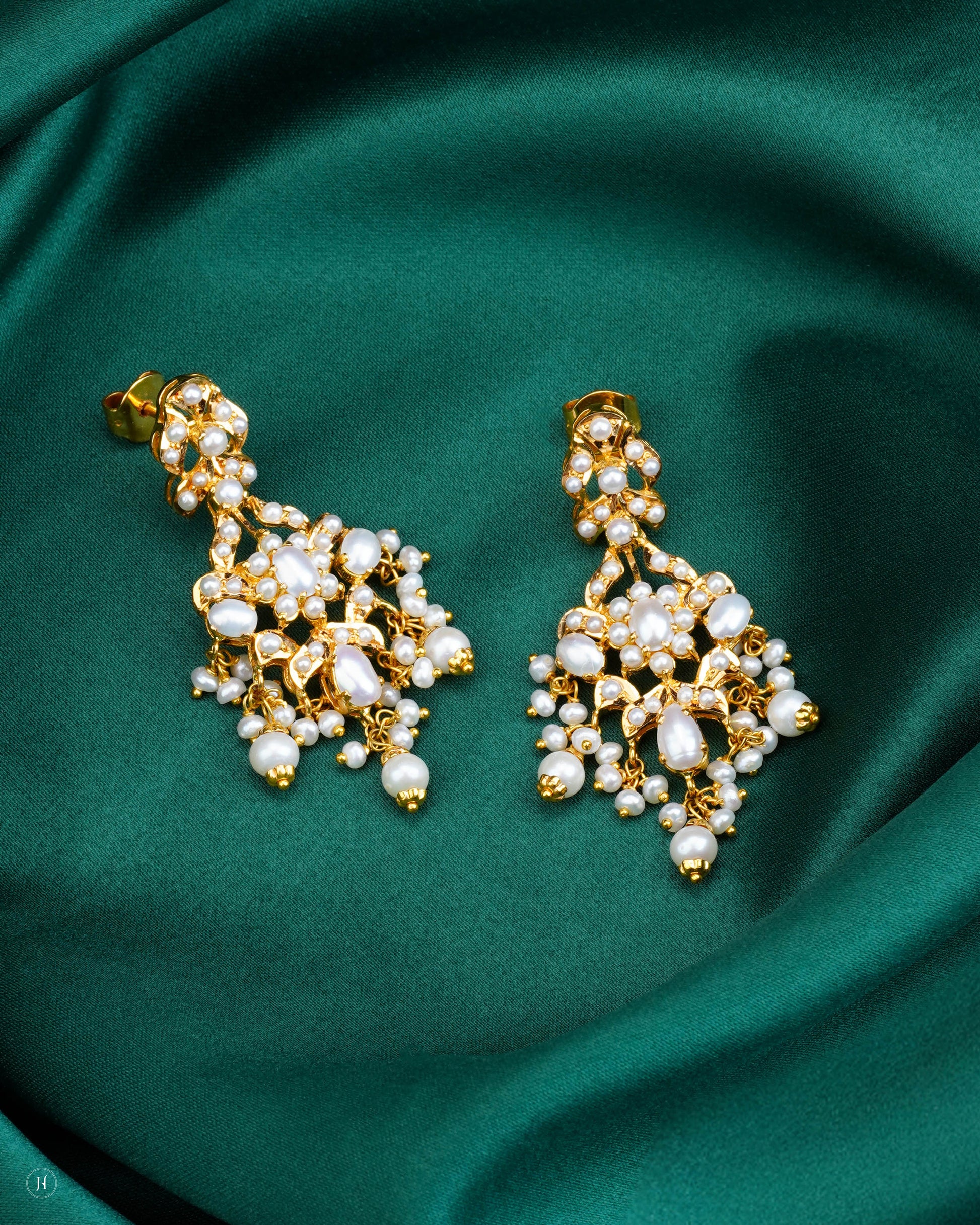 This 21Karat yellow gold bridal Pakistani necklace set features an filigree design, highlighted with freshwater pearls. The elegant necklace is complemented by matching statement chandelier earrings, creating a royal and harmonious look.