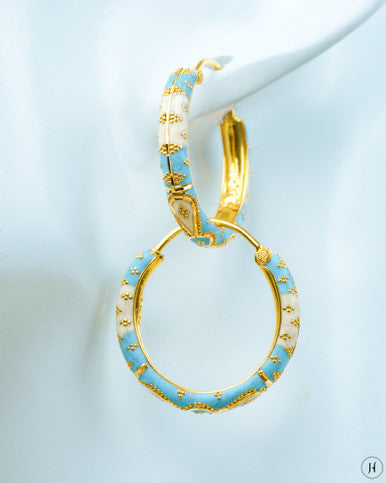 These 21K yellow gold infinity hoop earrings are laced with cream and sky blue enamel and traditional Emirati milgrain patterns.