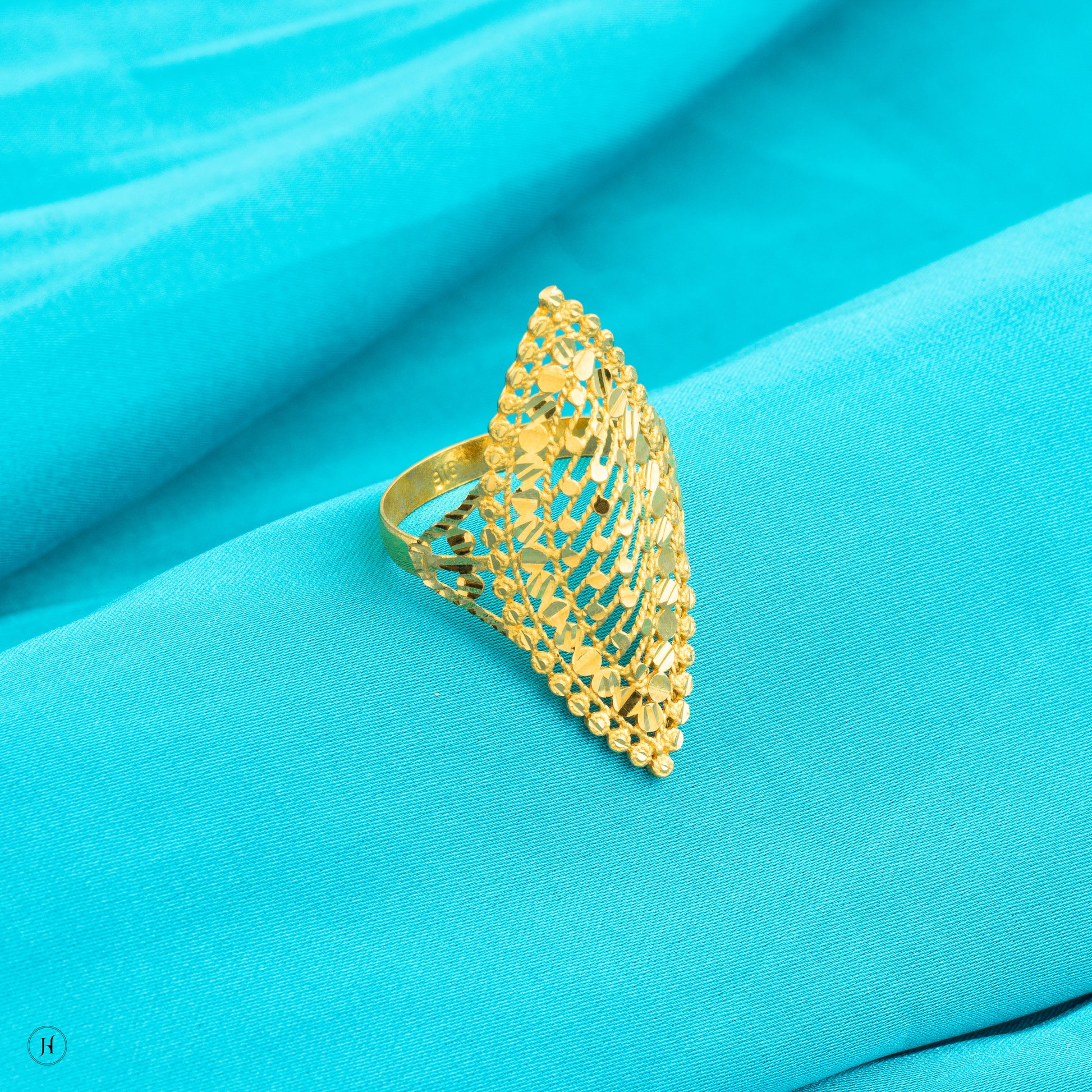This 22K yellow gold marquise, oval-shaped Bahraini ring features an open-work design that gives it a light and elegant feel, making it a perfect statement piece. It is ideal for special occasions or as a gift for a loved one.