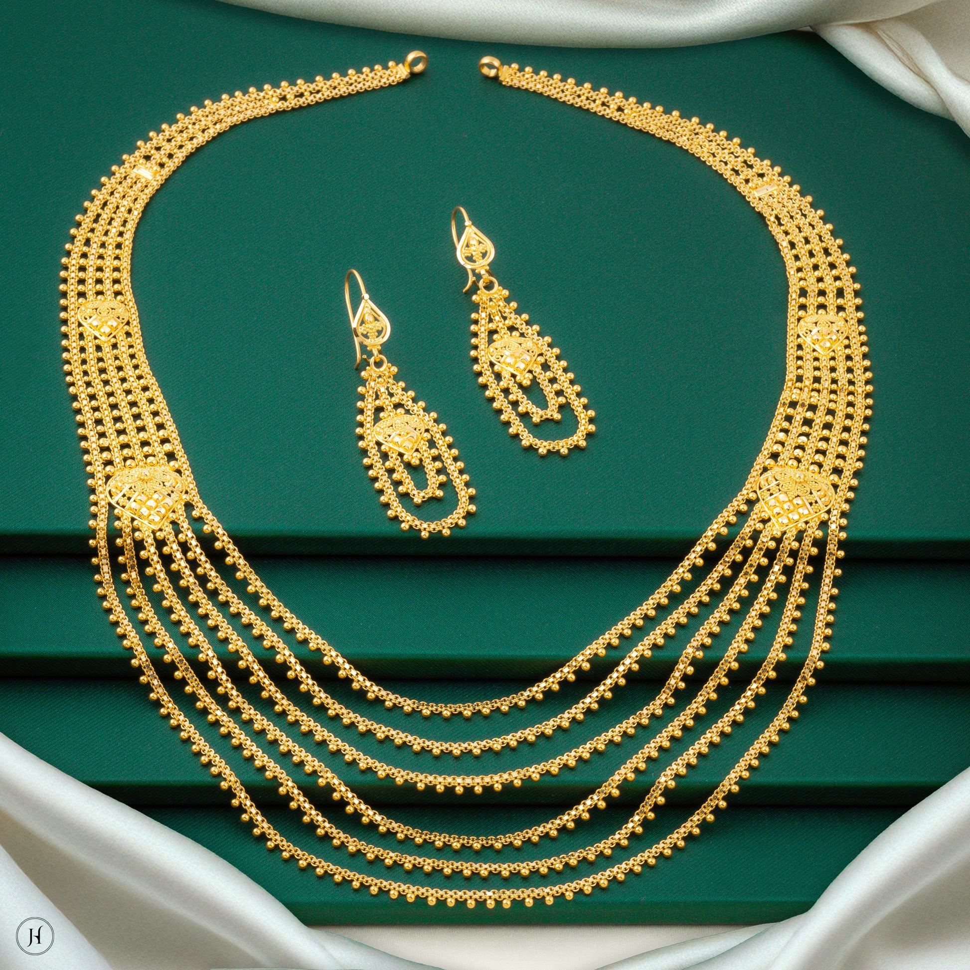The 22K yellow gold elegant multi-layered necklace set features a cascading design of multiple rows of gold beads, adorned with i heart-shaped and lattice patterns, and includes matching dangly earrings secured with fish hook clasp.